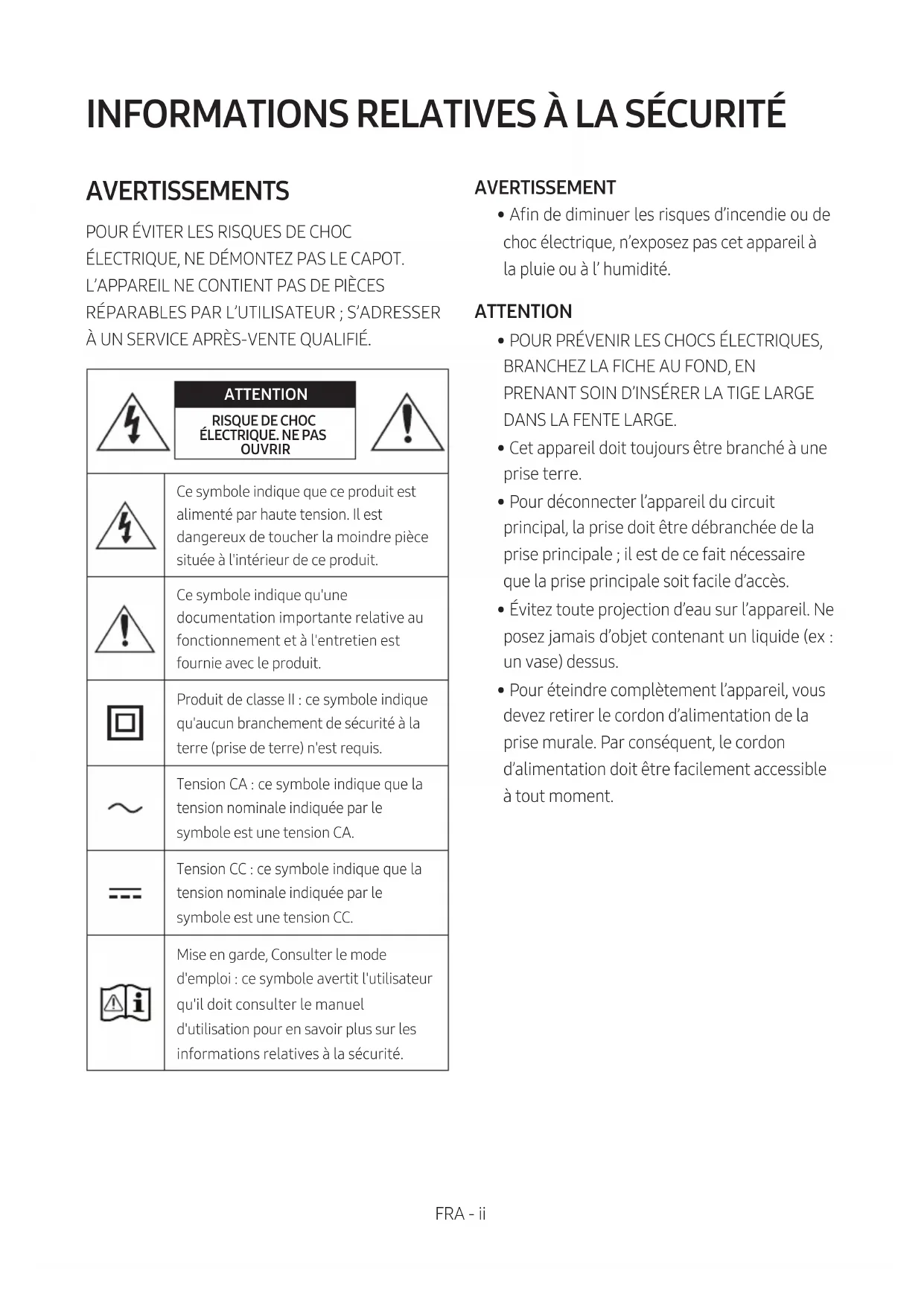 ÉLECTRIQUE, NE DÉMONTEZ PAS LE CAPOT. L’APPAREIL NE CONTIENT PAS DE PIÈCES RÉPARABLES PAR L’UTILISATEUR ; S’ADRESSER À UN SERVICE APRÈS-VENTE QUALIFIÉ. ATTENTION RISQUE DE CHOC ÉLECTRIQUE. NE PAS OUVRIRCe symbole indique que ce produit est alimenté par haute tension. Il est dangereux de toucher la moindre pièce située à l'intérieur de ce produit.Ce symbole indique qu'une documentation importante relative au fonctionnement et à l'entretien est fournie avec le produit.Produit de classeII: ce symbole indique qu'aucun branchement de sécurité à la terre (prise de terre) n'est requis.Tension CA: ce symbole indique que la tension nominale indiquée par le symbole est une tension CA.Tension CC: ce symbole indique que la tension nominale indiquée par le symbole est une tension CC.Mise en garde, Consulter le mode d'emploi: ce symbole avertit l'utilisateur qu'il doit consulter le manuel d'utilisation pour en savoir plus sur les informations relatives à la sécurité. AVERTISSEMENT