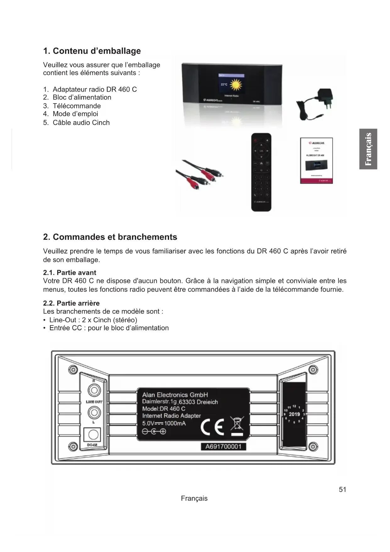 Veuillez prendre le temps de vous familiariser avec les fonctions du DR 460 C après l’avoir retiré de son emballage. 2.1. Partie avant Votre DR 460 C ne dispose d'aucun bouton. Grâce à la navigation simple et conviviale entre les menus, toutes les fonctions radio peuvent être commandées à l’aide de la télécommande fournie. 2.2. Partie arrière Les branchements de ce modèle sont :
