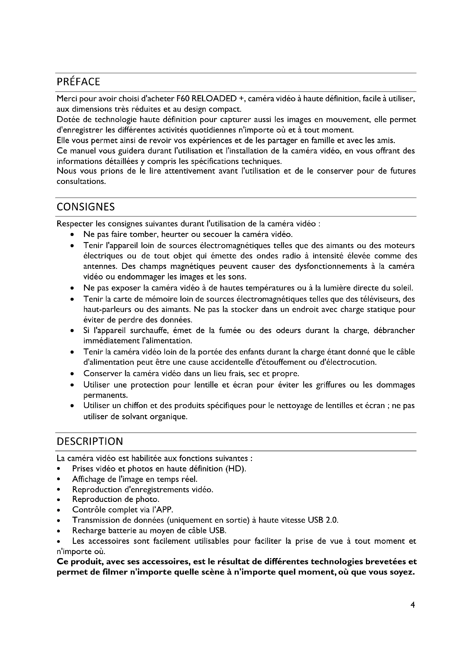 - GARANTIE ET REMARQUES LÉGALES PRÉFACE Merci pour avoir choisi d'acheter F60 RELOADED +, caméra vidéo à haute définition, facile à utiliser, aux dimensions très réduites et au design compact. Dotée de technologie haute définition pour capturer aussi les images en mouvement, elle permet d'enregistrer les différentes activités quotidiennes n'importe où et à tout moment. Elle vous permet ainsi de revoir vos expériences et de les partager en famille et avec les amis. Ce manuel vous guidera durant l'utilisation et l'installation de la caméra vidéo, en vous offrant des informations détaillées y compris les spécifications techniques. Nous vous prions de le lire attentivement avant l'utilisation et de le conserver pour de futures consultations. CONSIGNES Respecter les consignes suivantes durant l'utilisation de la caméra vidéo : p. 194