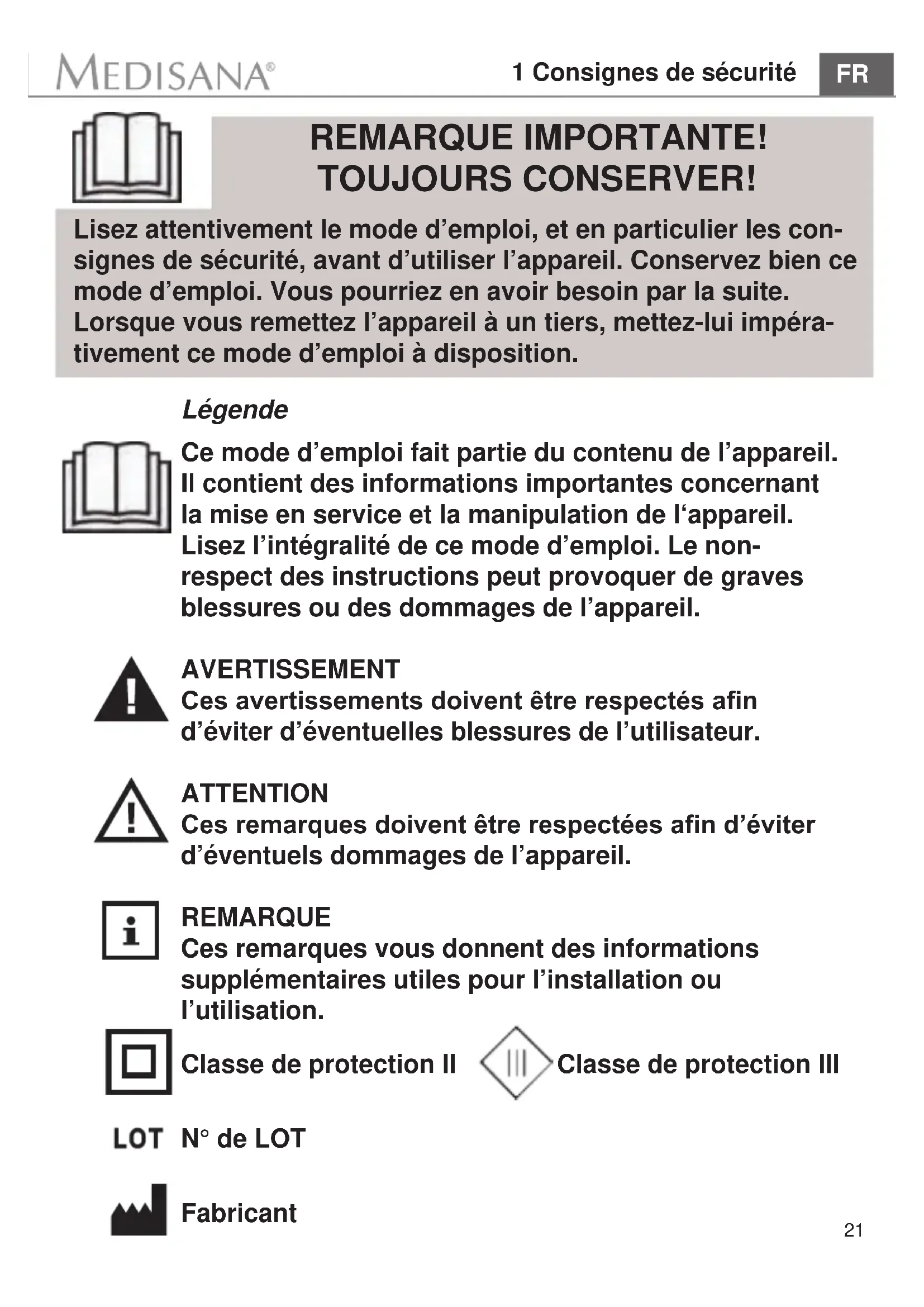 REMARQUE IMPORTANTE! TOUJOURS CONSERVER! Lisez attentivement le mode d’emploi, et en particulier les con- signes de sécurité, avant d’utiliser l’appareil. Conservez bien ce mode d’emploi. Vous pourriez en avoir besoin par la suite. Lorsque vous remettez l’appareil à un tiers, mettez-lui impéra- tivement ce mode d’emploi à disposition. Légende Ce mode d’emploi fait partie du contenu de l’appareil. Il contient des informations importantes concernant la mise en service et la manipulation de l‘appareil. Lisez l’intégralité de ce mode d’emploi. Le non- respect des instructions peut provoquer de graves blessures ou des dommages de l’appareil. AVERTISSEMENT Ces avertissements doivent être respectés an d’éviter d’éventuelles blessures de l’utilisateur. ATTENTION Ces remarques doivent être respectées an d’éviter d’éventuels dommages de l’appareil. REMARQUE Ces remarques vous donnent des informations supplémentaires utiles pour l’installation ou l’utilisation.22 1 Consignes de sécurité