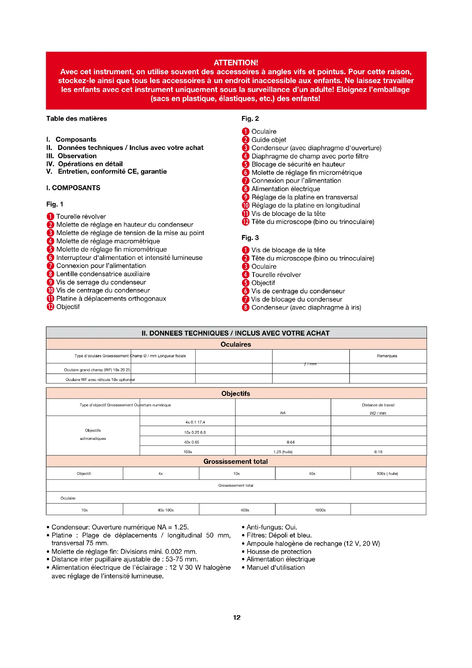 ATTENTION! Avec cet instrument, on utilise souvent des accessoires à angles vifs et pointus. Pour cette raison, stockez-le ainsi que tous les accessoires à un endroit inaccessible aux enfants. Ne laissez travailler les enfants avec cet instrument uniquement sous la surveillance d’un adulte! Eloignez l’emballage (sacs en plastique, élastiques, etc.) des enfants! Objectif: 4x 10x 40x 100x ( huile) Grossissement total Oculaire: 10x 40x 100x 400x 1000x Grossissement total1313