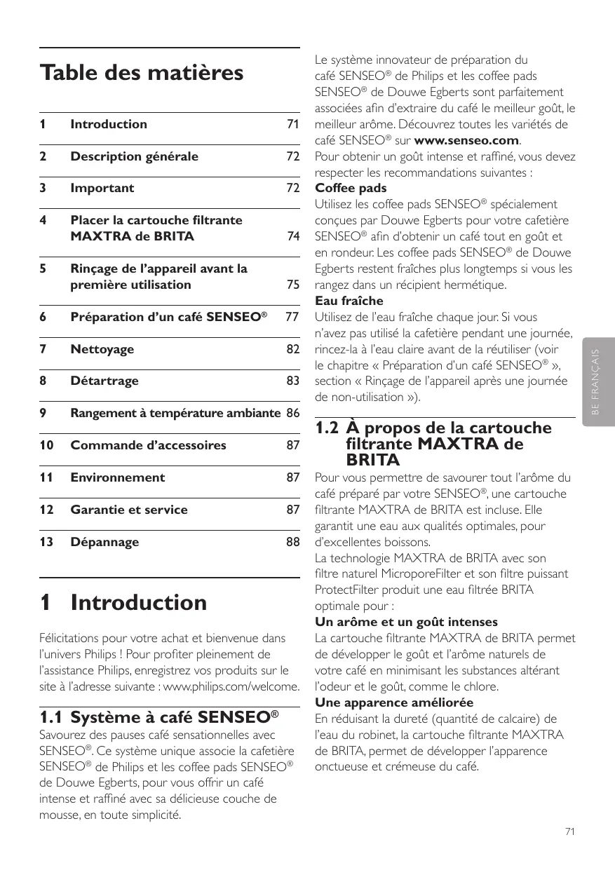 •• Cet appareil est destiné à un usage domestique normal uniquement. Il n’est pas destiné à être utilisé dans des environnements tels que des cuisines destinées aux employés dans les entreprises, magasins et autres environnements de travail. Il n’est pas non plus destiné à être utilisé par des clients dans des hôtels, motels, chambres d’hôtes et autres environnements résidentiels. Informations importantes à propos de la cartouche filtrante MAXTRA de BRITA •• Si votre cafetière SENSEO® a besoin d’être détartrée, enlevez toujours la cartouche filtrante MAXTRA de BRITA du porte-filtre dans le réservoir d’eau. Après le détartrage, nettoyez le réservoir d’eau et le porte-filtre, puis réinsérez la cartouche filtrante MAXTRA de BRITA. •• Conservez toujours les cartouches filtrantes de dans leur emballage hermétique d‘origine et dans un endroit frais et sec. •• La cartouche filtrante MAXTRA de BRITA est uniquement conçue pour être utilisée avec de l‘eau traitée par les services municipaux (note : cette eau fait l‘objet d‘un contrôle constant et sa potabilité est conforme aux dispositions légales) ou provenant de sources privées dont la qualité est attestée. Si les services publics exigent de faire bouillir l‘eau du robinet, cette mesure s‘applique aussi à l‘eau filtrée BRITA. A la levée de cette mesure, le réservoir d’eau du SENSEO® et l’entonnoir devra être nettoyée et une nouvelle cartouche filtrante insérée. •• Seule l‘eau froide du robinet convient à la filtration. •• Nettoyez régulièrement le réservoir d’eau et l’entonnoir. •• Pour certains groupes de personnes (notamment ceux qui souffrent de déficiences immunitaires et les nourrissons), il est recommandé de faire bouillir l‘eau du robinet. Cette mesure s’applique aussi à l’eau filtrée.