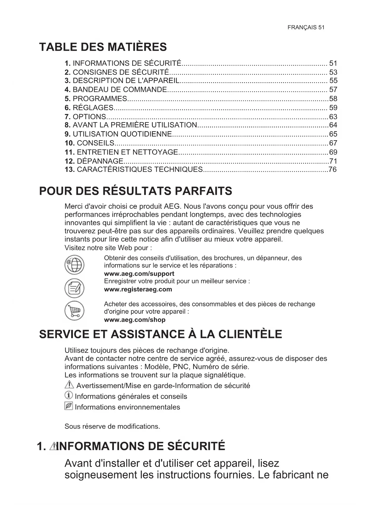 Merci d'avoir choisi ce produit AEG. Nous l'avons conçu pour vous offrir des performances irréprochables pendant longtemps, avec des technologies innovantes qui simplifient la vie : autant de caractéristiques que vous ne trouverez peut-être pas sur des appareils ordinaires. Veuillez prendre quelques instants pour lire cette notice afin d'utiliser au mieux votre appareil. Visitez notre site Web pour : Obtenir des conseils d'utilisation, des brochures, un dépanneur, des informations sur le service et les réparations : www.aeg.com/support Enregistrer votre produit pour un meilleur service : www.registeraeg.com Acheter des accessoires, des consommables et des pièces de rechange d'origine pour votre appareil : www.aeg.com/shop
