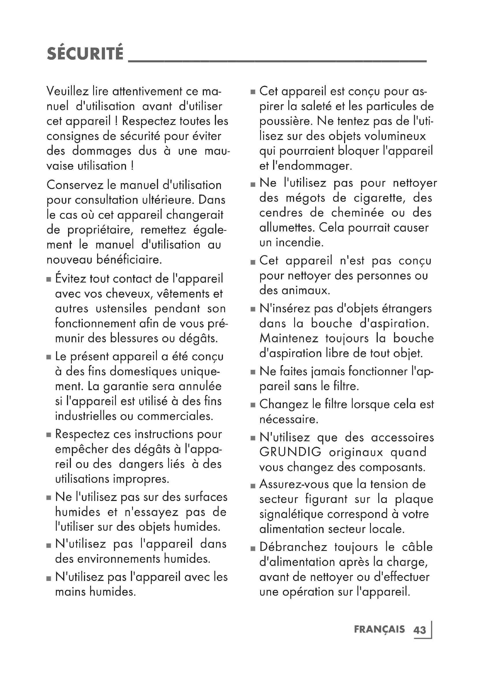 Utilisez uniquement le câble d'alimentation fourni.45 FRANÇAIS APERÇU ___________________________________ Chère cliente, cher client, Toutes nos félicitations pour l’achat de votre nouvel aspirateur vertical rechargeable 2 en 1 GRUNDIG VCH 9630-VCH 9631-VCH 9632. Veuillez lire attentivement les consignes d'utilisation ci-après pour profiter au maximum, pendant de nombreuses années à venir, de votre produit de qualité Grundig. Une approche responsable ! GRUNDIG se concentre sur des conditions de travail sociales avec des salaires justes pour ses employés et ses fournisseurs, sur l’utilisation efficace de matériaux bruts avec une constante réduction des déchets de plusieurs tonnes de plastique chaque année – et sur une disponibilité d’au moins 5 ans de tous les accessoires. Pour un avenir digne d’être vécu. Pour une bonne raison. Grundig. Filtre HEPA HEPA signifie système de filtration des particules de l'air à haute efficacité. Les filtres HEPA sont des filtres à air à particules, qui filtrent plus de 99,9 % des particules de poussière dans l'air plus grandes que 0,1 à 0,3 micromètre. Les virus, poussières inhalables, œufs et excréments d'acariens, pollen, particules de fumée, amiante, bactéries, différentes poussières toxiques et aérosols sont capturés dans le filtre. Accessoires supplémentaires