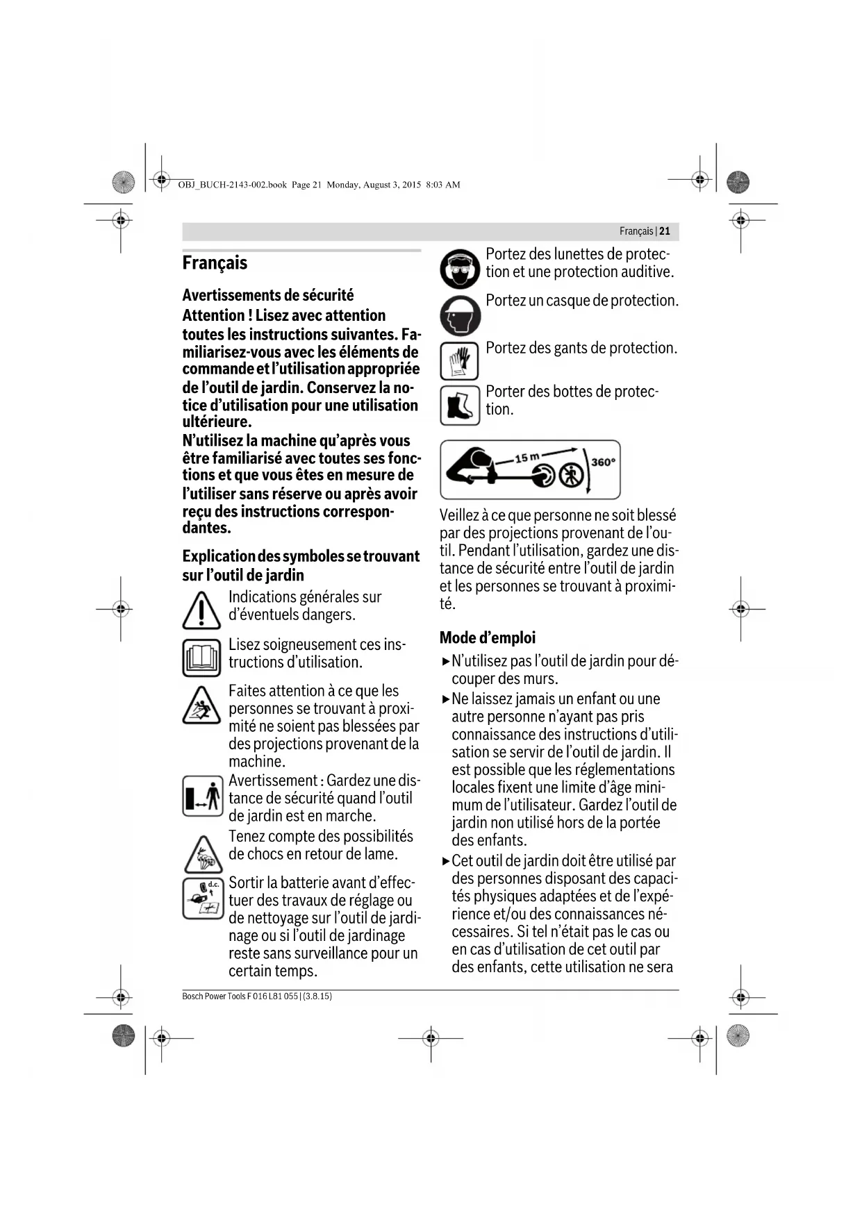 tance de sécurité quand l’outil de jardin est en marche. Tenez compte des possibilités de chocs en retour de lame. Sortir la batterie avant d’effec- tuer des travaux de réglage ou de nettoyage sur l’outil de jardi- nage ou si l’outil de jardinage reste sans surveillance pour un certain temps. Portez des lunettes de protec- tion et une protection auditive. Portez un casque de protection. Portez des gants de protection. Porter des bottes de protec- tion. Veillez à ce que personne ne soit blessé par des projections provenant de l’ou- til. Pendant l’utilisation, gardez une dis- tance de sécurité entre l’outil de jardin et les personnes se trouvant à proximi- té. Mode d’emploi N’utilisez pas l’outil de jardin pour dé- couper des murs. Ne laissez jamais un enfant ou une autre personne n’ayant pas pris connaissance des instructions d’utili- sation se servir de l’outil de jardin. Il est possible que les réglementations locales fixent une limite d’âge mini- mum de l’utilisateur. Gardez l’outil de jardin non utilisé hors de la portée des enfants. Cet outil de jardin doit être utilisé par des personnes disposant des capaci- tés physiques adaptées et de l’expé- rience et/ou des connaissances né- cessaires. Si tel n’était pas le cas ou en cas d’utilisation de cet outil par des enfants, cette utilisation ne sera d.c. OBJ_BUCH-2143-002.book Page 21 Monday, August 3, 2015 8:03 AM22 | Français F 016 L81 055 | (3.8.15) Bosch Power Tools possible que sous la surveillance d’une personne responsable de la sé- curité des utilisateurs ou que ces der- niers aient été instruits quant au ma- niement de l’outil. Dans le cas contraire, un risque de mauvaise utili- sation et de blessures existe. Les enfants doivent etre surveilles pour assurer qu’ils ne jouent pas avec l’outil de jardin. N’utilisez jamais l’outil de jardin lorsque des personnes, en particulier des enfants ou des animaux domes- tiques, se trouvent à proximité. L’opérateur ou l’utilisateur de la ton- deuse est responsable des accidents et des dommages causés à autrui ou à ses biens. Ne faites jamais fonctionner l’outil de jardin si vous marchez pieds nus ou portez des sandales ouvertes. Portez toujours des chaussures fermées et des pantalons longs. Inspectez soigneusement la surface à travailler et éliminez pierres, bâtons, fils métalliques, os et autres objets étrangers. N’utilisez pas l’outil de jardin aux en- droits où se trouvent des câbles de secteur. Avant l’utilisation, contrôlez toujours si la lame, l’écrou de lame ou la tête de fil ne présentent des signes d’usure ou d’endommagement. Remplacez toujours un set complet de lames usées ou endommagées et d’écrous de lame afin d’éviter des dé- fauts d’équilibrage. Ne travaillez que de jour ou sous un bon éclairage artificiel. Ne pas travailler avec l’outil de jardin dans des conditions météorologiques défavorables et plus particulièrement en cas d’approche d’orage. Soyez vigilant quand vous utilisez l’outil de jardin dans des herbes hu- mides. Veillez à toujours garder une position stable quand vous utilisez l’outil de jardin; marcher normalement, ne ja- mais courir. Veillez à toujours garder une position stable et un bon équilibre. Ne pas su- restimer vos capacités. Portez une protection auditive et des lunettes de protection lorsque vous utilisez l’outil de jardin. N’utilisez jamais un outil de jardin dont les dispositifs de protection font défaut ou sont montés de manière in- correcte ou sont endommagés. Avant et après chaque utilisation, contrôlez l’outil de jardin pour détec- ter des usures ou dommages. Ne pas utiliser l’outil de jardin lorsque vous êtes fatigué ou sous l’emprise de drogues, d’alcool ou de médica- ments. Travailler sur des talus peut être dangereux. – N’utilisez pas l’outil de jardin sur des pentes très abruptes. – Sur des pentes ou de l’herbe mouil- lée, faites attention à ne pas perdre l’équilibre. – Toujours utiliser l’outil de jardin perpendiculairement à la pente, ja- mais de haut en bas ou de bas en haut. OBJ_BUCH-2143-002.book Page 22 Monday, August 3, 2015 8:03 AMFrançais | 23 Bosch Power Tools F 016 L81 055 | (3.8.15) – Faites très attention lors d’un change- ment de direction sur une pente. Tenez vos mains et pieds à l’écart de la lame, surtout lors du démarrage du moteur. Attendez l’arrêt total des pièces en rotation avant de les toucher. Après la mise hors tension de l’outil de jar- din, les éléments de coupe conti- nuent à tourner, pouvant provoquer ainsi des blessures. Veillez à vous protéger contre toute blessure pouvant être provoquée par le couteau intégré pour couper le fil. Après avoir rempli la bobine de fil/fait avancer le fil, tournez toujours l’outil de jardin à l’horizontale en position de travail avant de le remettre en marche. Arrêtez l’outil de jardin pour le dépla- cer entre deux surfaces à tailler. Arrêtez l’outil de jardin et sortez la batterie de son compartiment : – lorsque l’outil de jardin est laissé sans surveillance, – avant d’éliminer un engorgement, – avant de changer le dispositif de coupe, – pour contrôler, nettoyer ou effec- tuer des travaux sur l’outil de jardin, – après avoir heurté un objet étran- ger. Vérifiez immédiatement que l’outil de jardin ne présente pas d’endommagements, et, si néces- saire, faites-le réparer, – si l’outil de jardin commence à vi- brer anormalement (vérifier immé- diatement). N’effectuez aucune modification sur l’outil de jardin. Des modifica- tions non autorisées peuvent s’avérer préjudiciables à la sécurité de votre outil de jardin et conduiront à une augmentation des émissions de bruit et des vibrations. N’utilisez que des accessoires recom- mandés et agréés pour les outils de jardin Bosch Professional. L’outil de jardin p