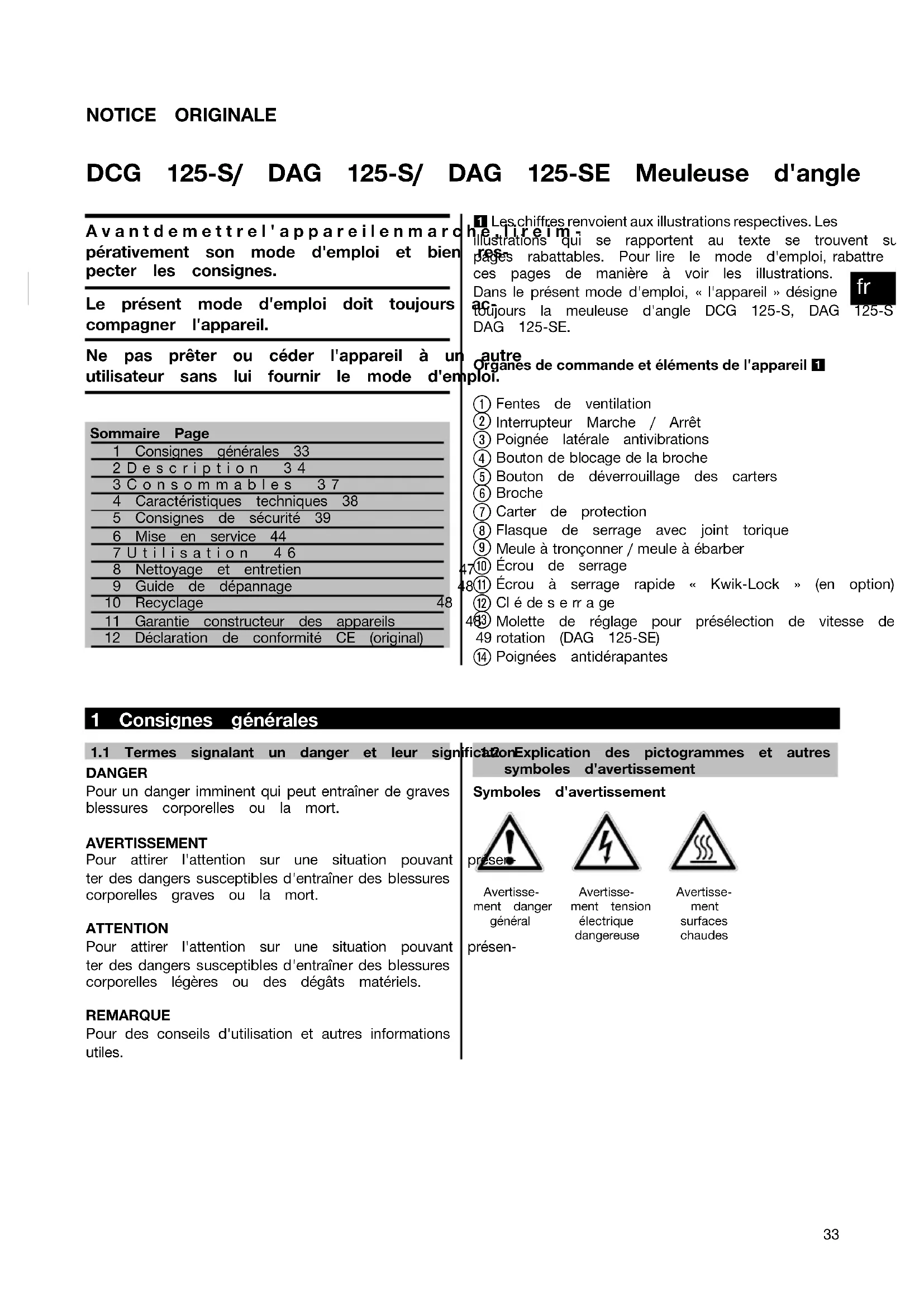 Printed: 20.11.2013 | Doc-Nr: PUB / 5069490 / 000 / 02NOTICE ORIGINALE DCG 125‑S/ DAG 125‑S/ DAG 125‑SE Meuleuse d'angle Avantdemettrel'appareilenmarche,lireim- pérativement son mode d'emploi et bien res- pecter les consignes. Le présent mode d'emploi doit toujours ac- compagner l'appareil. Ne pas prêter ou céder l'appareil à un autre utilisateur sans lui fournir le mode d'emploi. Sommaire Page1 Consignes générales 332Description 343Consommables 374 Caractéristiques techniques 385 Consignes de sécurité 396 Mise en service 447Utilisation 468 Nettoyage et entretien 479 Guide de dépannage 4810 Recyclage 4811 Garantie constructeur des appareils 4812 Déclaration de conformité CE (original) 49 1 Les chiffres renvoient aux illustrations respectives. Les illustrations qui se rapportent au texte se trouvent sur lespages rabattables. Pour lire le mode d'emploi, rabattreces pages de manière à voir les illustrations. Dans le présent mode d'emploi, « l'appareil » désigne toujours la meuleuse d'angle DCG 125‑S, DAG 125‑S ouDAG 125‑SE. Organesdecommandeetélémentsdel'appareil1
