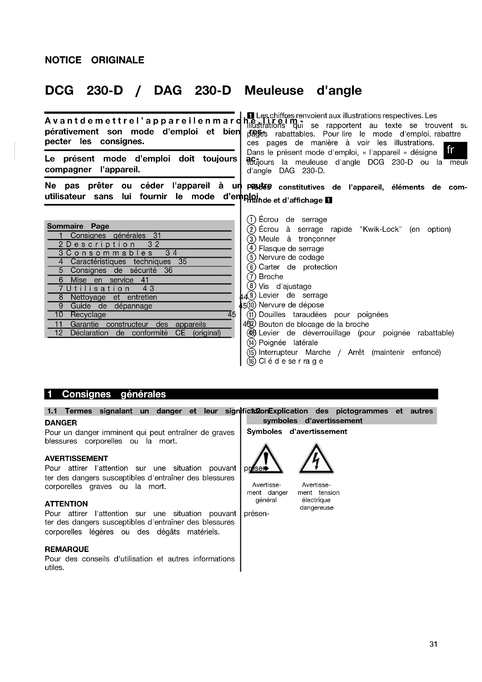 Printed: 20.11.2013 | Doc-Nr: PUB / 5069494 / 000 / 02NOTICE ORIGINALE DCG 230‑D / DAG 230‑D Meuleuse d'angle Avantdemettrel'appareilenmarche,lireim- pérativement son mode d'emploi et bien res- pecter les consignes. Le présent mode d'emploi doit toujours ac- compagner l'appareil. Ne pas prêter ou céder l'appareil à un autre utilisateur sans lui fournir le mode d'emploi. Sommaire Page1 Consignes générales 312Description 323Consommables 344 Caractéristiques techniques 355 Consignes de sécurité 366 Mise en service 417Utilisation 438 Nettoyage et entretien 449 Guide de dépannage 4510 Recyclage 4511 Garantie constructeur des appareils 4512 Déclaration de conformité CE (original) 46 1 Les chiffres renvoient aux illustrations respectives. Les illustrations qui se rapportent au texte se trouvent sur lespages rabattables. Pour lire le mode d'emploi, rabattreces pages de manière à voir les illustrations. Dans le présent mode d'emploi, « l'appareil » désigne toujours la meuleuse d'angle DCG 230‑D ou la meuleused'angle DAG 230‑D.Pièces constitutives de l'appareil, éléments de com- mandeetd'affichage1