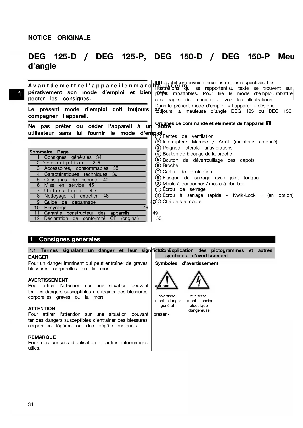 Hilti DEG 125-D/-P, DEG 150-D/-P, Pos.1, Art. Nr.285965/A3, 18.09.2013 Printed: 21.11.2013 | Doc-Nr: PUB / 5162491 / 000 / 00NOTICE ORIGINALE DEG 125‑D / DEG 125‑P, DEG 150‑D / DEG 150‑P Meuleuse d'angle Avantdemettrel'appareilenmarche,lireim- pérativement son mode d'emploi et bien res- pecter les consignes. Le présent mode d'emploi doit toujours ac- compagner l'appareil. Ne pas prêter ou céder l'appareil à un autre utilisateur sans lui fournir le mode d'emploi. Sommaire Page1 Consignes générales 342Description 353 Accessoires, consommables 384 Caractéristiques techniques 395 Consignes de sécurité 406 Mise en service 457Utilisation 478 Nettoyage et entretien 489 Guide de dépannage 4910 Recyclage 4911 Garantie constructeur des appareils 4912 Déclaration de conformité CE (original) 50 1 Les chiffres renvoient aux illustrations respectives. Les illustrations qui se rapportent au texte se trouvent sur lespages rabattables. Pour lire le mode d'emploi, rabattreces pages de manière à voir les illustrations. Dans le présent mode d'emploi, « l'appareil » désigne toujours la meuleuse d'angle DEG 125 ou DEG 150. Organesdecommandeetélémentsdel'appareil1