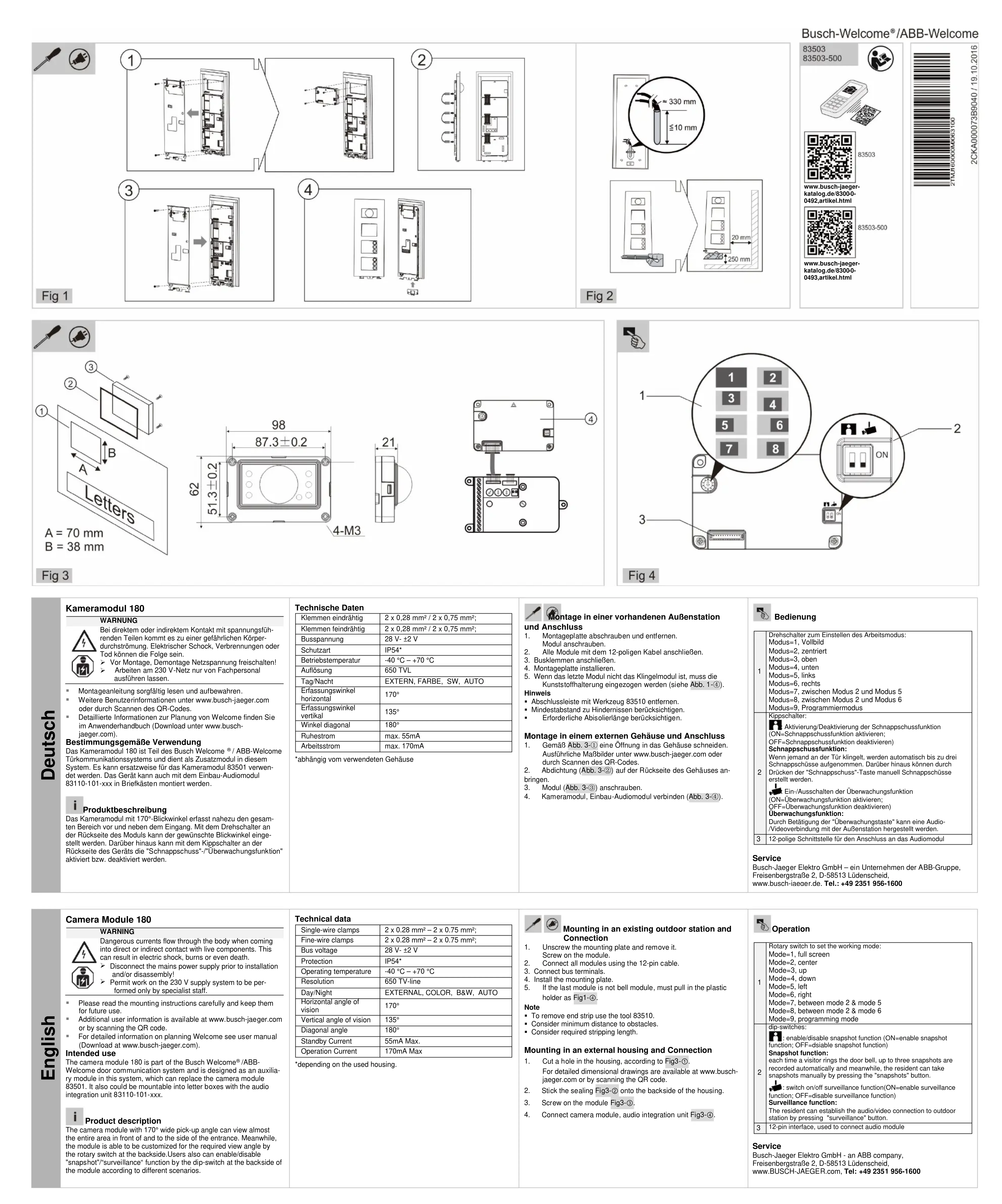- Vous trouvenes des informations detaillées sur la planification de systèmes Welter receive dans le manuel d'utilisation (telechargeable, l'ADDRESS www. busch-jaeger. com). Utilisation conforme Le Module de camera 180 fait partir du systeme di interphonique Busch Welcome ^61 ABB-Welcome et sort de module supplémentaire dans les programmes d'interphonique (CIFAC), le programme de la camera 83501. Un montage de l'appliée dans des boltes à lettres, is also possible with the module audio to encastment 8310-110-1xxx.