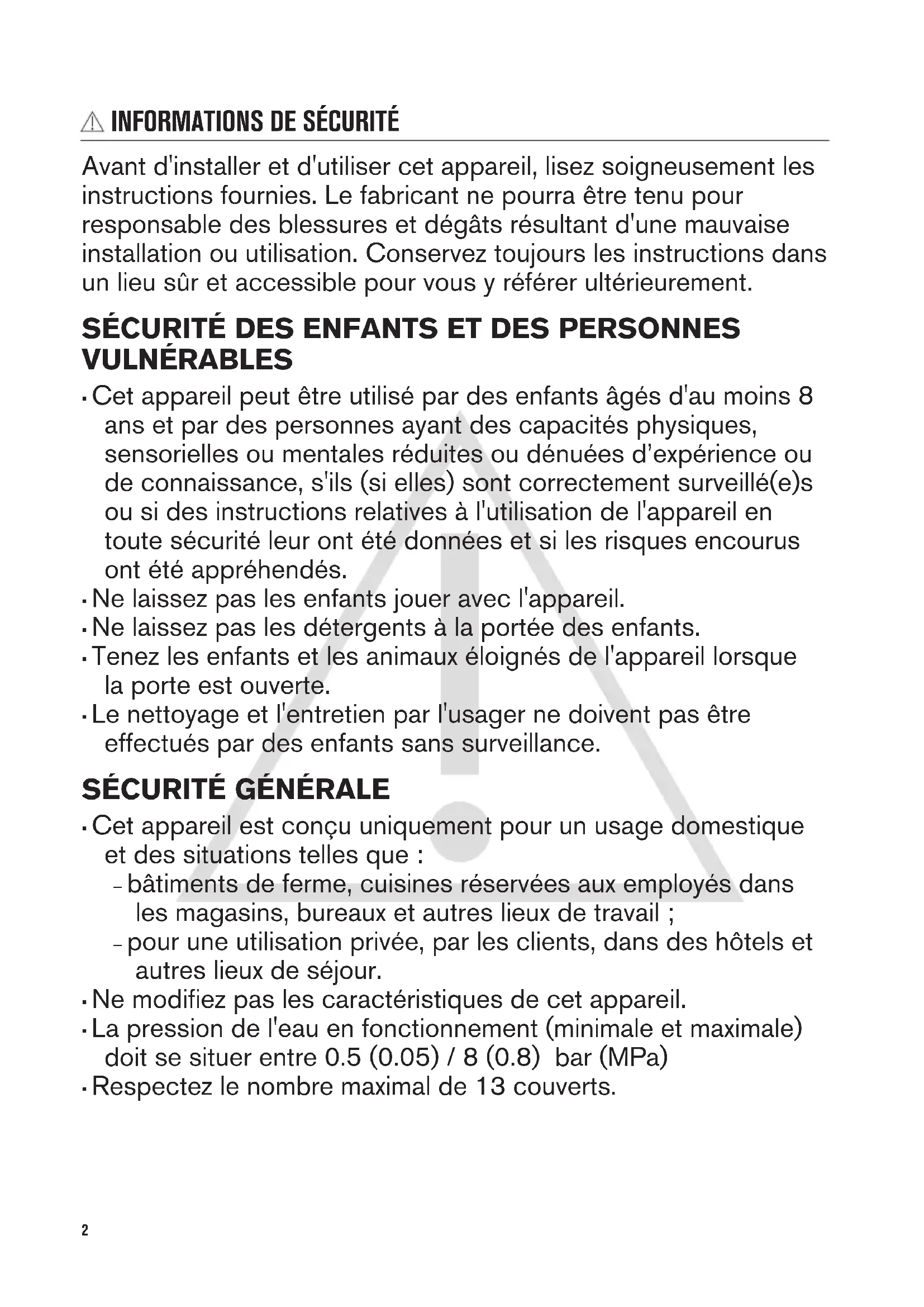 - Respectez le nombre maximal de 13 couverts. 2• Si le câble d'alimentation est endommagé, il doit être remplacé par le fabricant, un service de maintenance agréé ou un technicien qualifié afin d'éviter tout danger.
