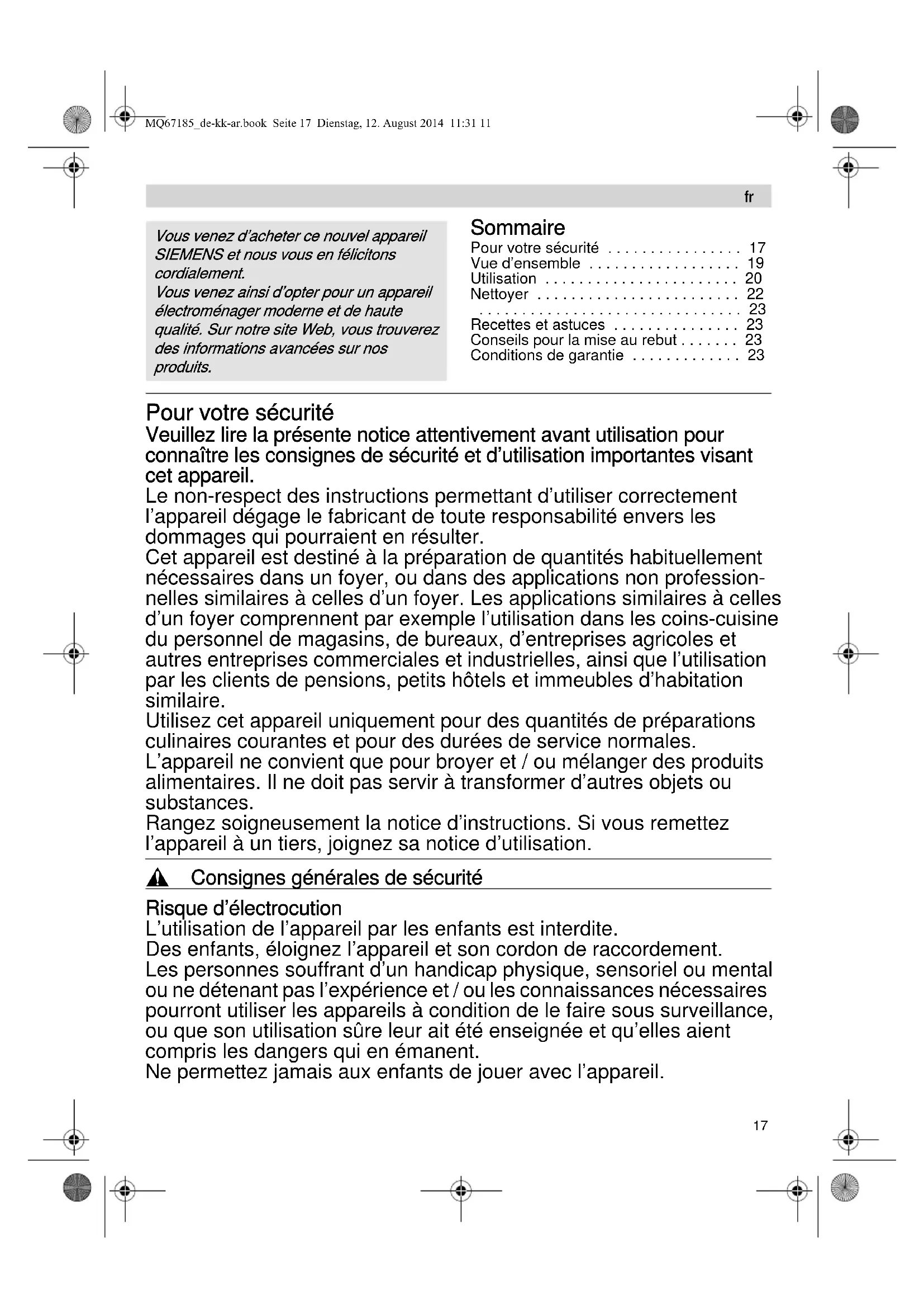 Vous venez d’acheter ce nouvel appareil SIEMENS et nous vous en félicitons cordialement. Vous venez ainsi d’opter pour un appareil électroménager moderne et de haute qualité. Sur notre site Web, vous trouverez des informations avancées sur nos produits. MQ67185_de-kk-ar.book Seite 17 Dienstag, 12. August 2014 11:31 1118 Ne branchez et faites marcher l’appareil que conformément aux indications figurant sur la plaque signalétique. N’utilisez cet appareil que dans des locaux fermés. N’utilisez l’appareil que si son cordon d’alimentation et l’appareil lui-même ne présentent aucun dommage. Débranchez toujours l’appareil du secteur s’il doit se trouver sans surveillance, avant de l’assembler, de le démonter ou de le nettoyer. Veillez à ce que le cordon de branchement ne frotte pas sur des arêtes vives ou des surfaces très chaudes. Afin d’écarter tout danger, seul le fabricant ou son service après-vente ou une personne détenant une qualification équivalente est habilité à remplacer un cordon de branchement endommagé. Les réparations sur l’appareil sont réservées à notre service après- vente. , Consignes de sécurité pour cet appareil Risque de blessure Risque d’électrocution ! N’utilisez pas le mixeur plongeant avec les mains mouillées et ne le faites pas tourner à vide. Lorsque vous plongez le mixeur dans un liquide, veillez à ce que le niveau de liquide ne monte pas au-dessus de la jonction entre le pied mixeur et l’appareil de base. Ne plongez jamais l’appareil de base dans des liquides et ne le lavez pas au lave-vaisselle. Prudence lors du traitement de liquides très chauds. L’appareil risque de provoquer des projection de liquide. Ne posez jamais le pied mixeur sur des surfaces très chaudes, ne l’utilisez jamais dans des produits à mélanger très chauds. Avant de plonger le pied mixeur dans des produits très chauds, attendez qu’ils soient revenus à moins de 80 °C ! Avant d’utiliser le mixeur plongeant dans une casserole, retirez préalablement cette dernière du foyer de cuisson. Risque de blessures avec les lames tranchantes / l’entraînement en rotation ! Avant de remplacer des accessoires ou des pièces supplémentaires déplacées en service, il faut éteindre l'appareil et le débrancher du secteur. N’approchez jamais les doigts de la lame située dans le pied mixeur. Ne nettoyez jamais les lames avec les mains nues. Utilisez une brosse. N’approchez jamais les doigts de la lame universelle. Ne saisissez la lame universelle que par son bord-poignée en plastique.