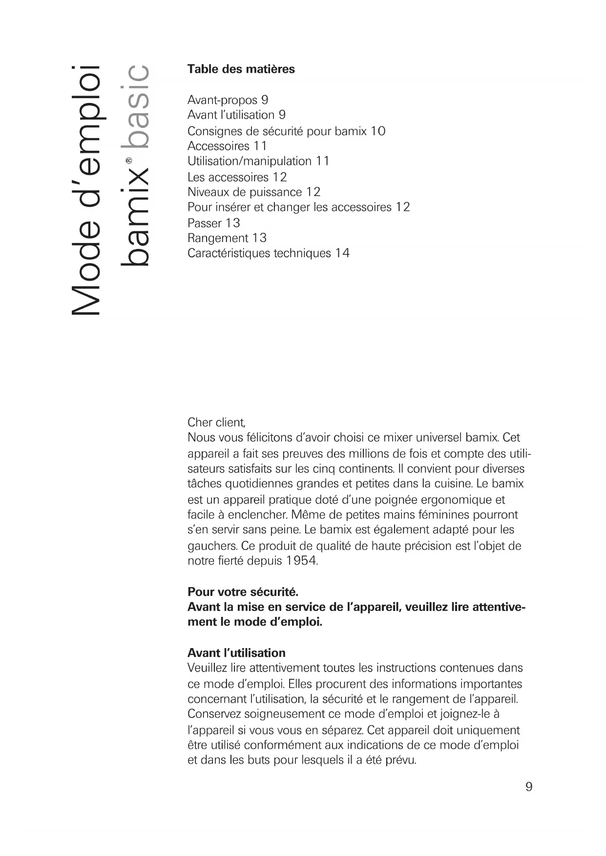 960 g Kurzzeitbetrieb 5 min Material und Gehäuse Sämtliche Teile sind rostfrei, nahrungsmittel- beständig und geschmacksneutral Prüfzeichen Hersteller ESGE AG, CH-9517 Mettlen/Schweiz Technische Änderungen vorbehalten. Obige Angaben sind länderspezifisch.9 Table des matières Avant-propos 9 Avant l’utilisation 9 Consignes de sécurité pour bamix 10 Accessoires 11 Utilisation/manipulation 11 Les accessoires 12 Niveaux de puissance 12 Pour insérer et changer les accessoires 12 Passer 13 Rangement 13 Caractéristiques techniques 14 Cher client, Nous vous félicitons d’avoir choisi ce mixer universel bamix. Cet appareil a fait ses preuves des millions de fois et compte des utili- sateurs satisfaits sur les cinq continents. Il convient pour diverses tâches quotidiennes grandes et petites dans la cuisine. Le bamix est un appareil pratique doté d’une poignée ergonomique et facile à enclencher. Même de petites mains féminines pourront s’en servir sans peine. Le bamix est également adapté pour les gauchers. Ce produit de qualité de haute précision est l’objet de notre fierté depuis 1954. Pour votre sécurité. Avant la mise en service de l’appareil, veuillez lire attentive- ment le mode d’emploi. Avant l’utilisation Veuillez lire attentivement toutes les instructions contenues dans ce mode d’emploi. Elles procurent des informations importantes concernant l’utilisation, la sécurité et le rangement de l’appareil. Conservez soigneusement ce mode d’emploi et joignez-le à l’appareil si vous vous en séparez. Cet appareil doit uniquement être utilisé conformément aux indications de ce mode d’emploi et dans les buts pour lesquels il a été prévu. Mode d’emploi bamix basic RObservez les consignes de sécurité Consignes de sécurité pour bamix