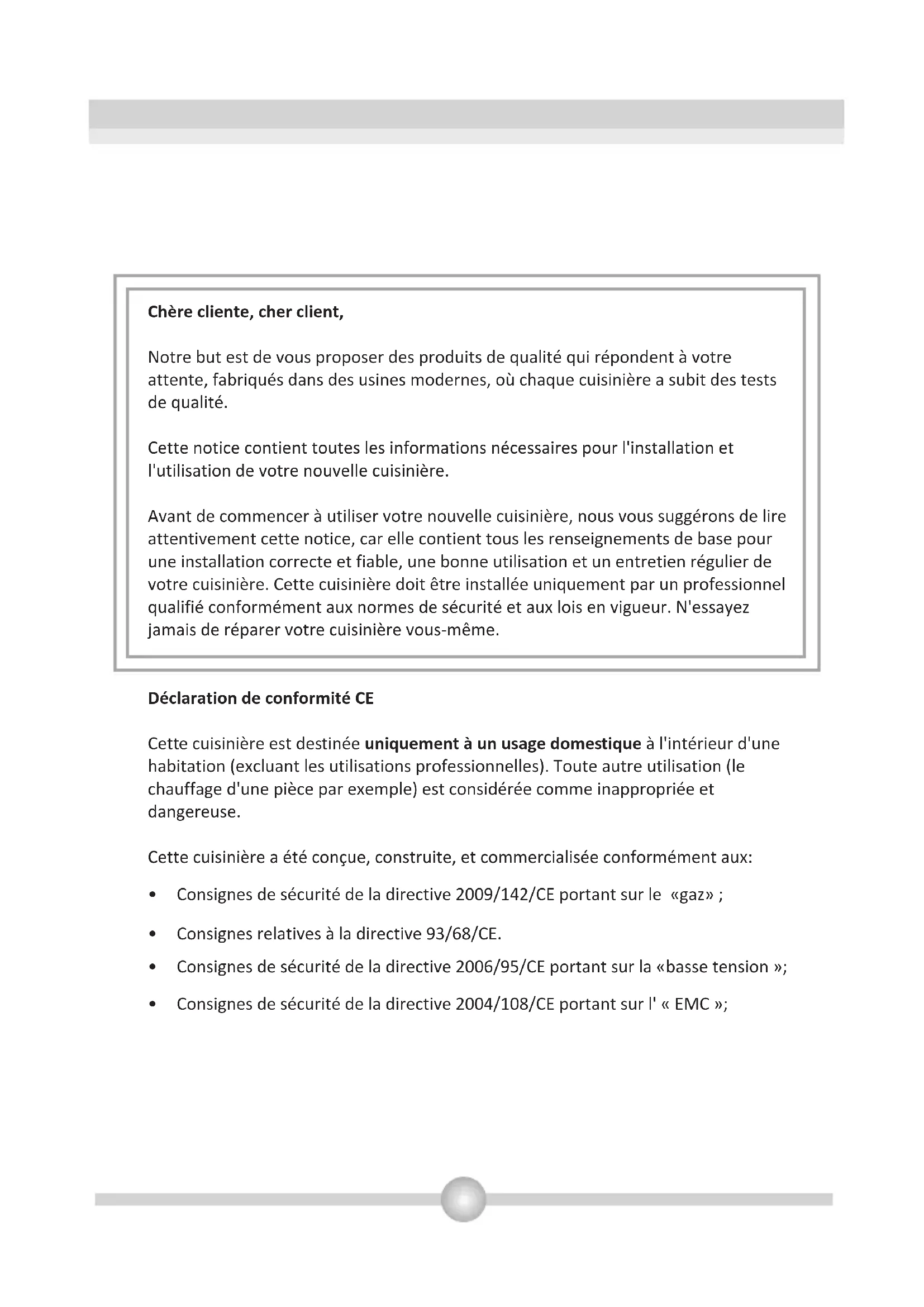 Cette cuisinière moderne, fonctionnelle et pratique, fabriquée avec les meilleurs pièces et matériaux, saura répondre à vos besoins sous tous les aspects. Avant d'utiliser votre cuisinière, lisez attentivement cette notice afin de connaître l'ensemble de ses fonctions, et obtenir les meilleurs résultats possibles. Pour une installation correcte, tenez compte des recommandations suivantes pour éviter tout problème ou toute situation dangereuse. Elles doivent aussi être lues par le technicien qui doit installer la cuisinière.