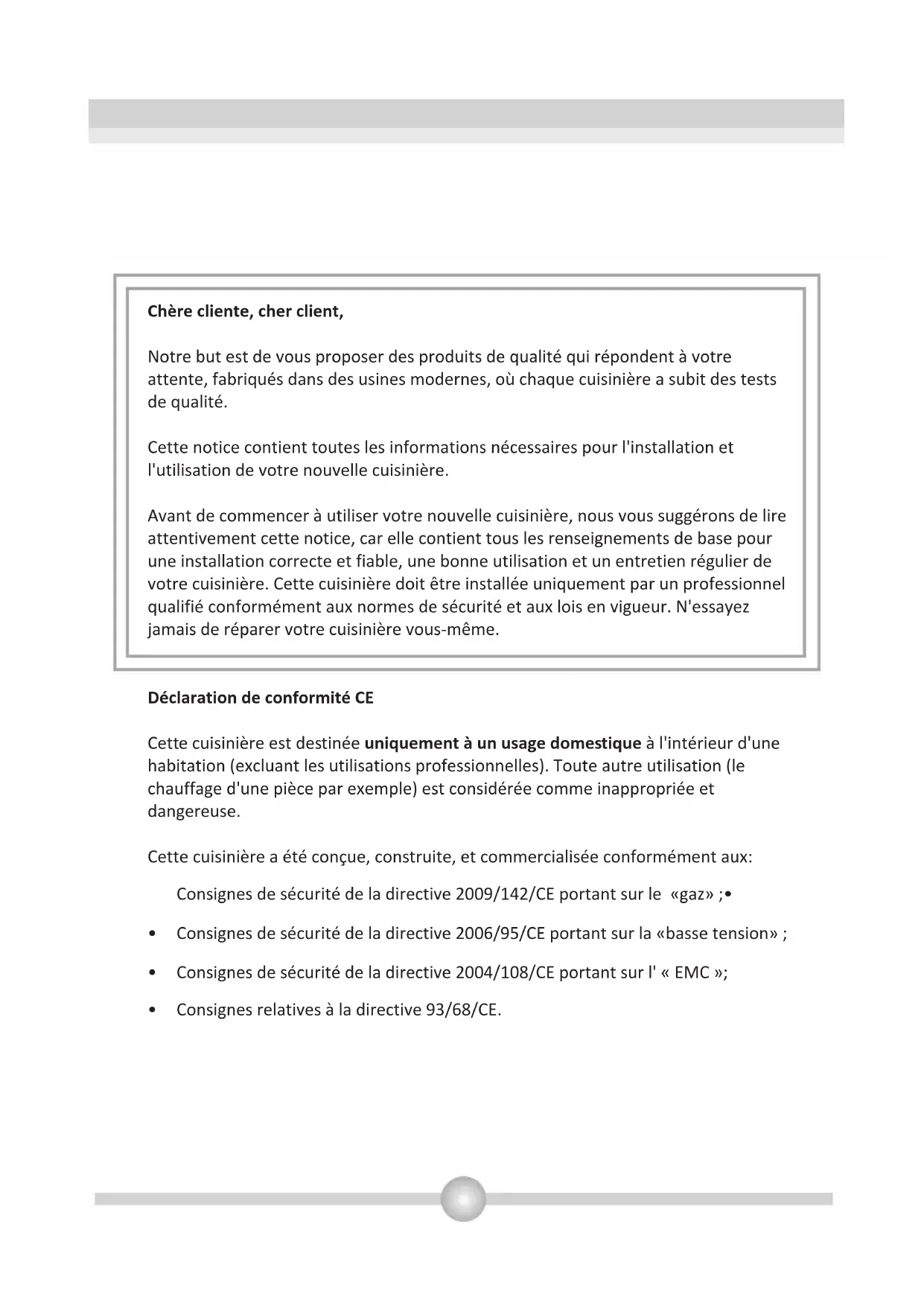 TCG66BChère cliente, cher client, Notre but est de vous proposer des produits de qualité qui répondent à votre attente, fabriqués dans des usines modernes, où chaque cuisinière a subit des tests de qualité. Cette notice contient toutes les informations nécessaires pour l'installation et l'utilisation de votre nouvelle cuisinière. Avant de commencer à utiliser votre nouvelle cuisinière, nous vous suggérons de lire attentivement cette notice, car elle contient tous les renseignements de base pour une installation correcte et fiable, une bonne utilisation et un entretien régulier de votre cuisinière. Cette cuisinière doit être installée uniquement par un professionnel qualifié conformément aux normes de sécurité et aux lois en vigueur. N'essayez jamais de réparer votre cuisinière vous-même. Déclaration de conformité CE Cette cuisinière est destinée uniquement à un usage domestique à l'intérieur d'une habitation (excluant les utilisations professionnelles). Toute autre utilisation (le chauffage d'une pièce par exemple) est considérée comme inappropriée et dangereuse. Cette cuisinière a été conçue, construite, et commercialisée conformément aux: Consignes de sécurité de la directive 2009/142/CE portant sur le «gaz» ;•