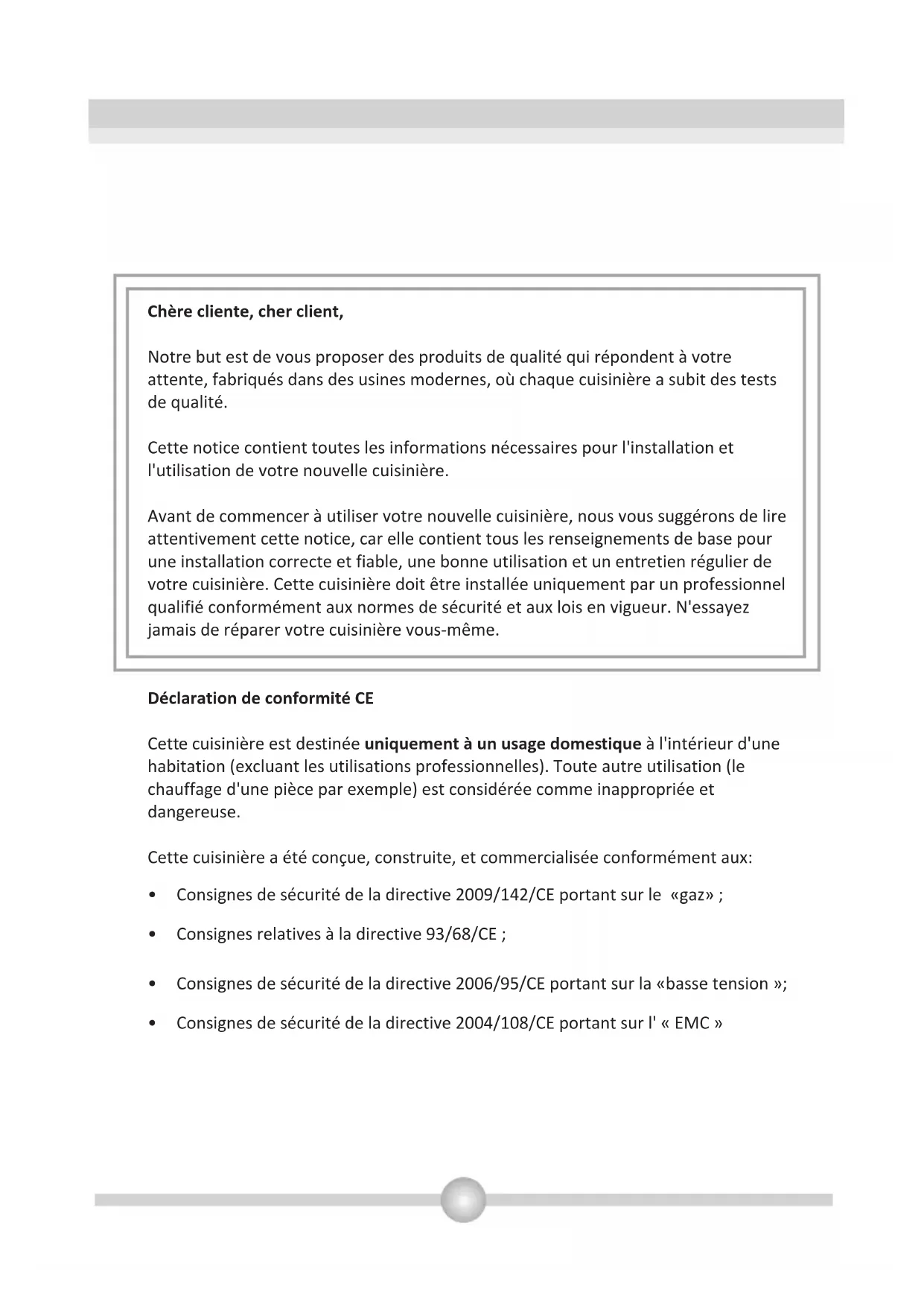 Cette cuisinière moderne, fonctionnelle et pratique, fabriquée avec les meilleurs pièces et matériaux, saura répondre à vos besoins sous tous les aspects. Avant d'utiliser votre cuisinière, lisez attentivement cette notice afin de connaître l'ensemble de ses fonctions, et obtenir les meilleurs résultats possibles. Pour une installation correcte, tenez compte des recommandations suivantes pour éviter tout problème ou toute situation dangereuse. Elles doivent aussi être lues par le technicien qui doit installer la cuisinière.