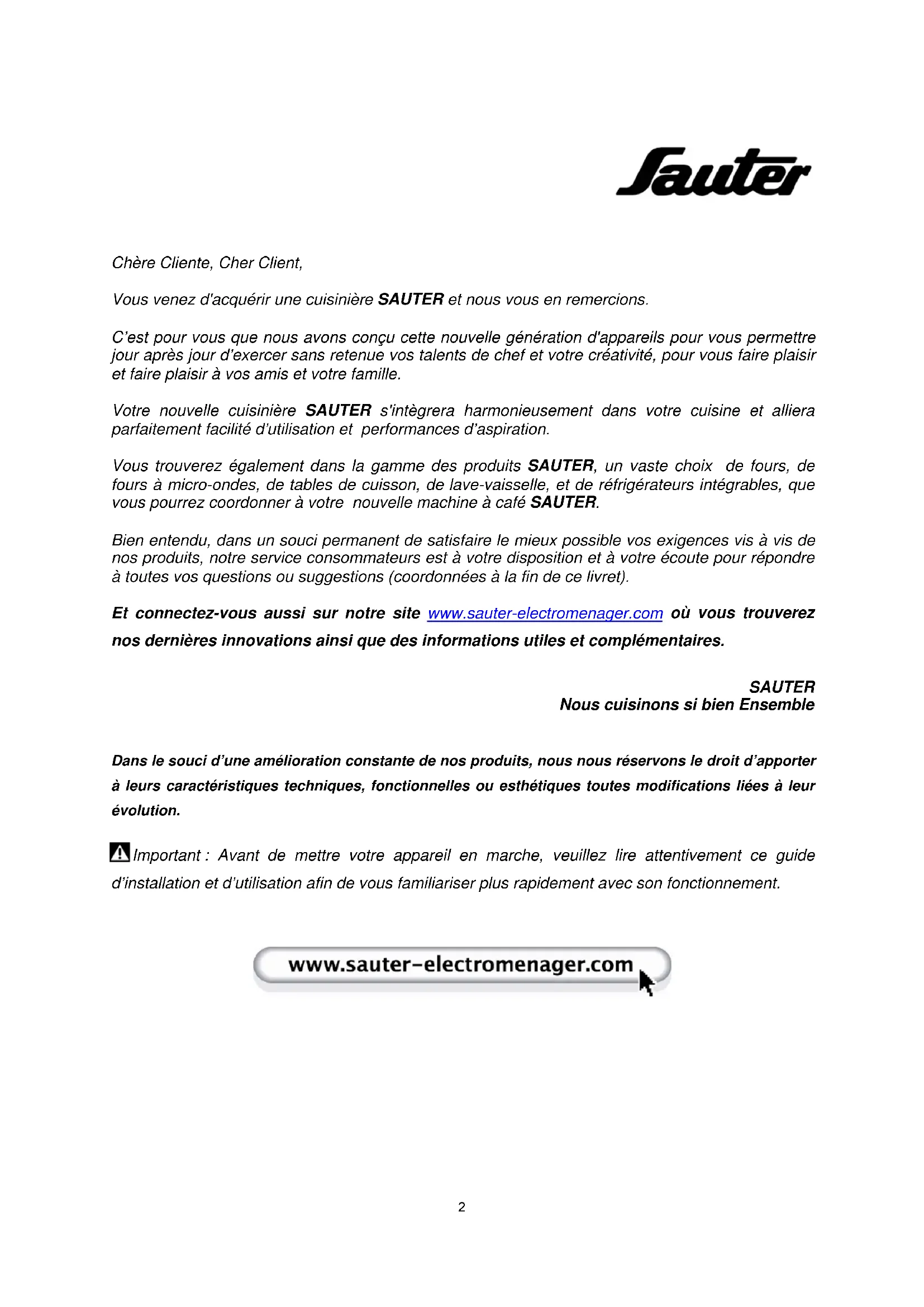 Chère Cliente, Cher Client, Vous venez d'acquérir une cuisinière SAUTER et nous vous en remercions. C’est pour vous que nous avons conçu cette nouvelle génération d'appareils pour vous permettre jour après jour d’exercer sans retenue vos talents de chef et votre créativité, pour vous faire plaisir et faire plaisir à vos amis et votre famille. Votre nouvelle cuisinière SAUTER s'intègrera harmonieusement dans votre cuisine et alliera parfaitement facilité d’utilisation et performances d’aspiration. Vous trouverez également dans la gamme des produits SAUTER, un vaste choix de fours, de fours à micro-ondes, de tables de cuisson, de lave-vaisselle, et de réfrigérateurs intégrables, que vous pourrez coordonner à votre nouvelle machine à café SAUTER. Bien entendu, dans un souci permanent de satisfaire le mieux possible vos exigences vis à vis de nos produits, notre service consommateurs est à votre disposition et à votre écoute pour répondre à toutes vos questions ou suggestions (coordonnées à la fin de ce livret). Et connectez-vous aussi sur notre site www.sauter-electromenager.com où vous trouverez nos dernières innovations ainsi que des informations utiles et complémentaires. SAUTER Nous cuisinons si bien Ensemble