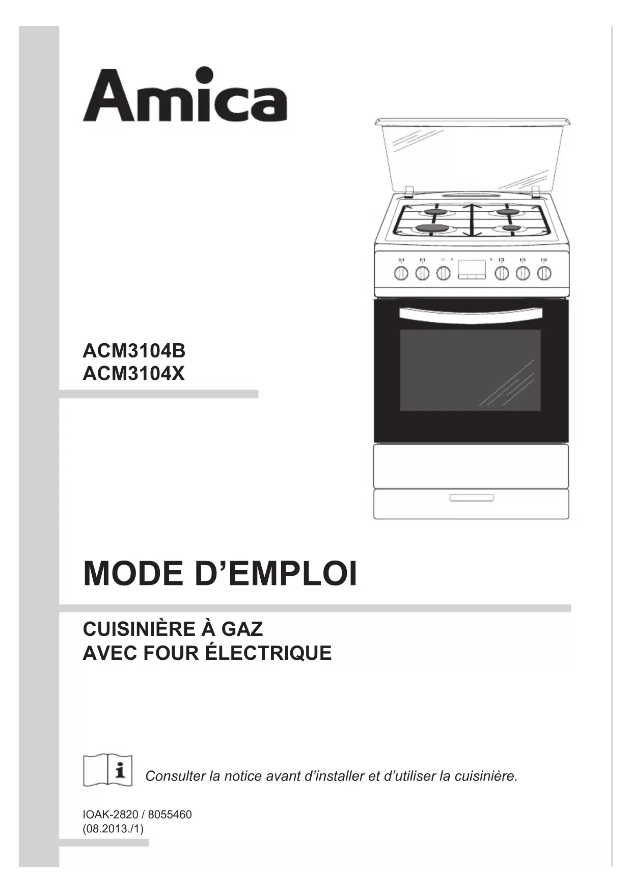 - IOAK-2820 / 8055460 (08.2013./1) ACM3104B ACM3104X2 Note! N’utiliser l’appareil qu’après avoir lu ce mode d’emploi. La cuisinière a été conçue uniquement pour un usage domestique. Le fabricant se réserve le droit d’effectuer des modications sans conséquences sur le fonctionnement de l’appareil CHER(S) CLIENT(S), La cuisinière Amica combine à la perfection la facilité d’utilisation et une efcacité optimale. Après lecture de ce mode d’emploi, vous n’aurez aucun problème pour utiliser ses fonctionnalités. À la sortie de l’usine, avant d’être emballée, la cuisinière a passé tous les tests de sécurité et de compatibilité. Prière de lire attentivement ce mode d’emploi avant la première mise en marche de l’appareil. Respecter les indications vous permettra d’éviter toute utilisation incorrecte. Conservez ce mode d’emploi dans un endroit accessible. Le respect des recommandations de ce mode d’emploi vous préservera de risques importants. En cas de doute ou si vous ne comprenez pas toutes les instructions de ce mode d’emploi, vous pouvez contacter notre service consommateur qui vous guidera en tous points utiles. Le n° de téléphone est : 01.56.48.06.31.3 INDICE Informations générales p. 2