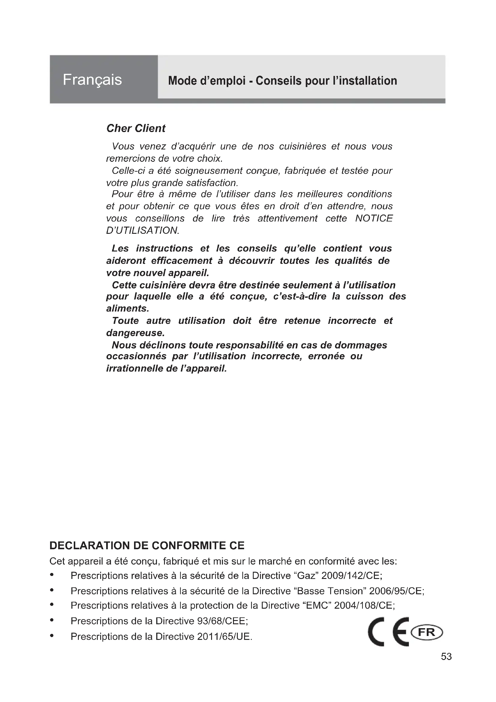 230 or 220-240 V~ 3 x 1,5 mm (*) (**)(*) Connection possible with plug and outlet(**) Connection with wall box connection. 230 V L1 N(L2)PE Fig. 9.3Fig. 9.1Fig. 9.2 230 or 220-240 V~515253 Cher Client Vous venez d’acquérir une de nos cuisinières et nous vous remercions de votre choix.Celle-ci a été soigneusement conçue, fabriquée et testée pour votre plus grande satisfaction.Pour être à même de l’utiliser dans les meilleures conditions et pour obtenir ce que vous êtes en droit d’en attendre, nous vous conseillons de lire très attentivement cette NOTICE D’UTILISATION.Les instructions et les conseils qu’elle contient vous aideront efcacement à découvrir toutes les qualités de votre nouvel appareil.Cette cuisinière devra être destinée seulement à l’utilisation pour laquelle elle a été conçue, c’est-à-dire la cuisson des aliments.Toute autre utilisation doit être retenue incorrecte et dangereuse.Nous déclinons toute responsabilité en cas de dommages occasionnés par l’utilisation incorrecte, erronée ou irrationnelle de l’appareil. Français Mode d’emploi - Conseils pour l’installation