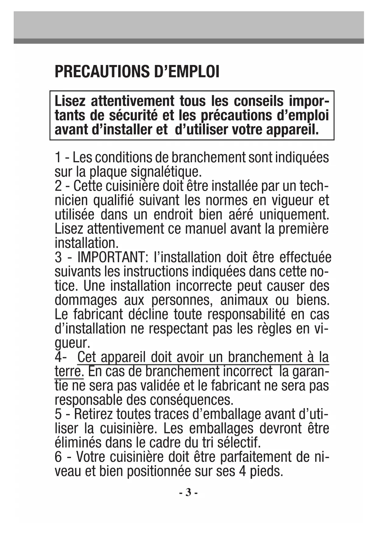 MENT AUX REGLEMENTATIONS EN VIGUEUR ET UTI- LISE DANS UN ENDROIT BIEN AERE. CONSULTER LA NOTICE AVANT D’INSTALLER ET D’UTILISER CET AP- PAREIL. Cher client Vous venez d’acquérir une de nos cuisinières et nous vous remercions de votre choix. Celle-ci a été soigneusement conçue, fabriquée et testée pour votre plus grande satisfaction. Nous vous conseillons de lire très attentivement cette notice d’utilisation. Les instructions et conseils vous aideront à utiliser au mieux votre cuisinière. Cette cuisinière est destinée unique- ment à un usage domestique, excluant l’usage professionnel. Nous déclinons toute responsabili- té en cas de dommages occasionnés par l’utilisa- tion incorrecte, erronée ou non compatible avec l’usage pour lequel elle a été conçue, c’est-à-dire la cuisson des aliments et non le chauffage d'un local par exemple.- 2 - SOMMAIRE PAGE