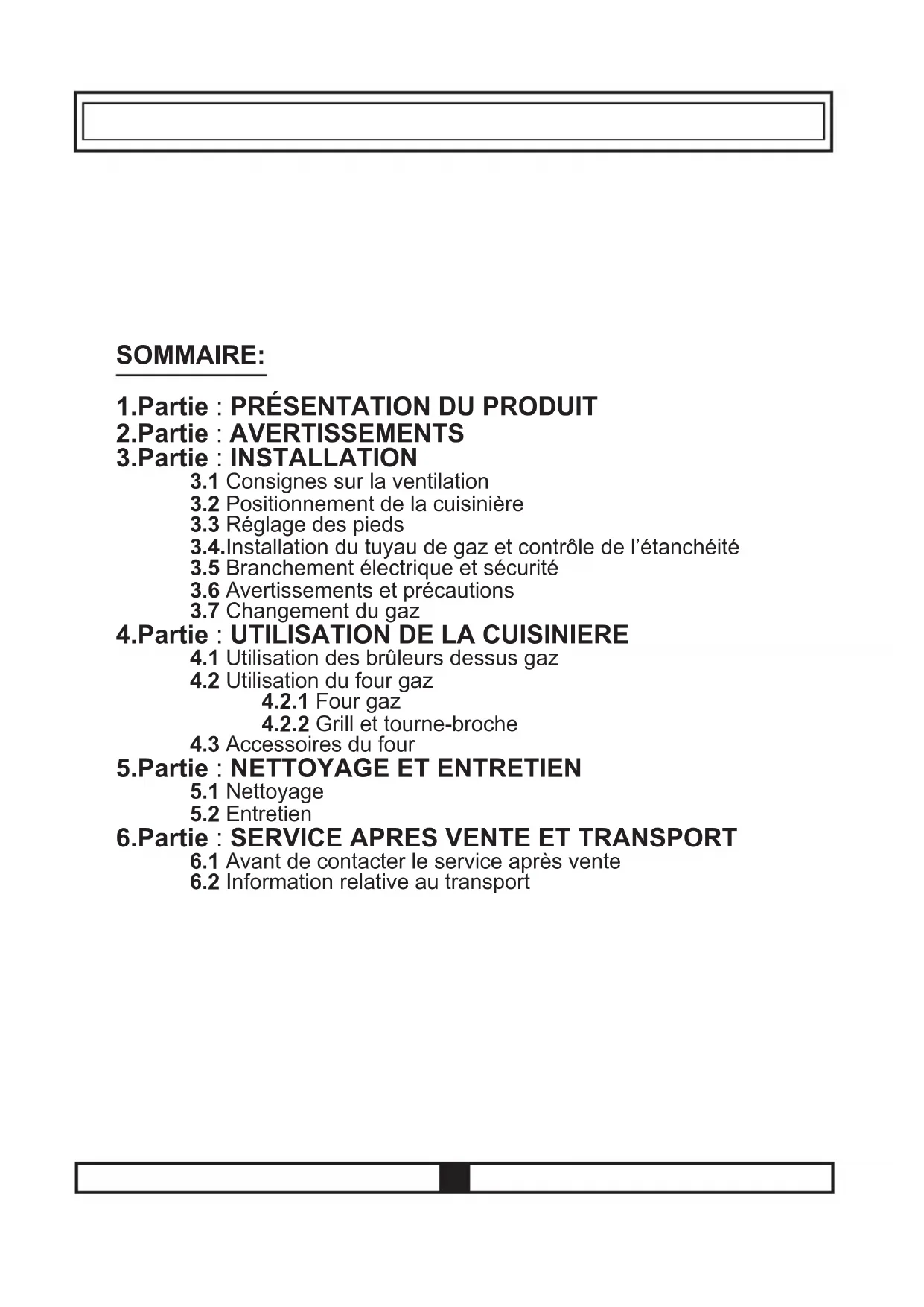 RESPECTEZ TOUTES LES MESURES DE SÉCURITÉ CI-DESSOUS ET LISEZ ENTIÈREMENT CETTE NOTICE AVANT DE COMMENCER A UTILISER LA CUISINIERE. Cette cuisinière a été conçue pour un usage domestique, excluant lusage professionnel Veuillez contrôler soigneusement que la cuisinière ne présente aucun dommage une fois déballée. En cas de dommage, ne pas lutiliser et contactez immédiatement votre revendeur. Étant donné que les matériaux d'emballage (nylon, agrafes, polystyrène, etc.) peuvent être dangereux pour les enfants, veuillez les assembler et les éloigner immédiatement. La cuisinière doit être installée et mise en marche par un technicien agréé. Le fabricant n'est pas tenu pour responsable des dommages causés par un mauvais emplacement ou une mauvaise installation réalisée par un personnel non-agréé. Avant de brancher votre cuisinière au réseau gaz et électrique, veuillez contrôler s'il est adapté aux indications précisées sur l'emballage ou sur la plaque signalétique située sur Ia cuisinière. Si vous n'avez pas l'intention d'utiliser Ia cuisinière pendant une longue période, débranchez la prise électrique. Veillez aussi à fermer le robinet de gaz lorsque vous n'utilisez pas I'appareil. Le câble d'alimentation électrique ne doit pas être changé par le client. Lorsqu'il est endommagé pour une raison quelconque, veuillez contacter votre service après vente. Débranchez toujours Ia cuisinière avant le nettoyage ou l'entretien. Certaines parties de Ia cuisinière peuvent rester chaudes après lutilisation. C'est pourquoi il est recommandé de laisser refroidir avant de toucher les parties directement exposées à la chaleur. Tenir les enfants hors de portée de la cuisinière. N'approchez pas de matières inflammables lorsque Ia cuisinière est en fonctionnement. Faites attention aux câbles dalimentation des autres appareils électriques qui se trouvent près de I'appareil, afin qu'ils ne soient pas en contact avec les zones chaudes. Veillez à ce que les manettes de la cuisinière soient bien sur «0» lorsque I'appareil n'est pas en marche. L'utilisation d'une cuisinière à gaz provoque toujours de la chaleur et de lhumidité dans la pièce où elle est installée. Assurez-vous que la cuisine est correctement ventilée conformément aux normes en vigueur. Gardez les ouvertures de ventilation naturelle ouvertes ou installez un appareil de ventilation mécanique (type hotte aspirante avec évacuation vers lextérieur) Une utilisation intensive prolongée de Ia cuisinière peut nécessiter une ventilation supplémentaire, par exemple en ouvrant une fenêtre ou en utilisant une ventilation plus efficace: vous pouvez par exemple augmenter le niveau de la ventilation mécanique si vous en avez une. Fermez tous les brûleurs avant de refermer le couvercle. Cette notice a été conçue pour plusieurs modèles. Votre cuisinière ne comprend peut-être pas toutes les caractéristiques décrites dans cette notice. Veuillez donc bien faire attention aux indications. POUR LEFFlCACITE ET LA SECURITE DE LA CUISINIERE, NOUS VOUS RECOMMANDONS D'UTILISER UNIQUEMENT LES PIECES DETACHEES DORIGINE ET DE NE FAIRE APPEL QUAU SERVICE APRES VENTE AGREE DU REVENDEUR EN CAS DE BESOINSection dentrée dair min. 100cm