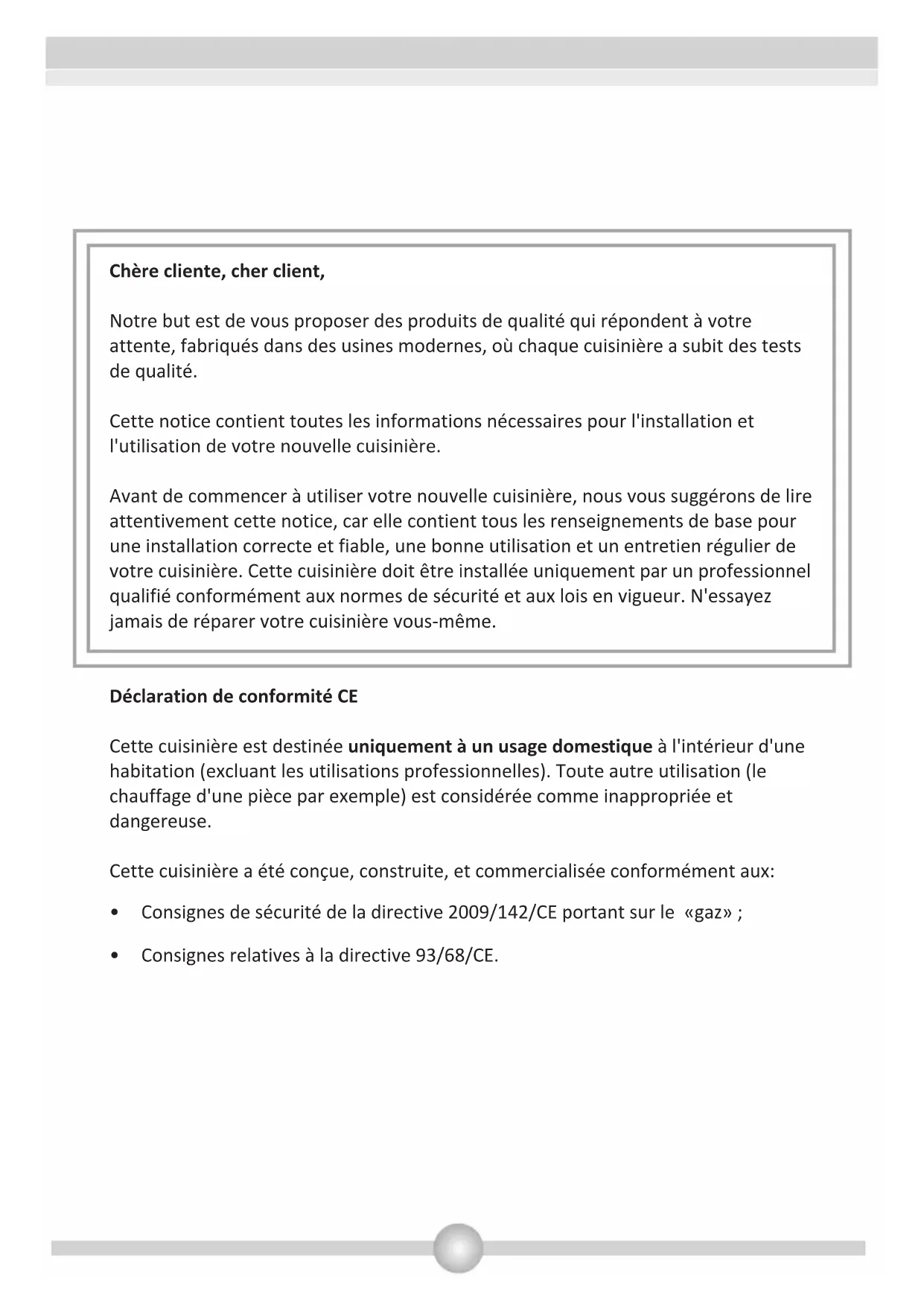 HCG50VT/1Chère cliente, cher client, Notre but est de vous proposer des produits de qualité qui répondent à votre attente, fabriqués dans des usines modernes, où chaque cuisinière a subit des tests de qualité. Cette notice contient toutes les informations nécessaires pour l'installation et l'utilisation de votre nouvelle cuisinière. Avant de commencer à utiliser votre nouvelle cuisinière, nous vous suggérons de lire attentivement cette notice, car elle contient tous les renseignements de base pour une installation correcte et fiable, une bonne utilisation et un entretien régulier de votre cuisinière. Cette cuisinière doit être installée uniquement par un professionnel qualifié conformément aux normes de sécurité et aux lois en vigueur. N'essayez jamais de réparer votre cuisinière vous-même. Déclaration de conformité CE Cette cuisinière est destinée uniquement à un usage domestique à l'intérieur d'une habitation (excluant les utilisations professionnelles). Toute autre utilisation (le chauffage d'une pièce par exemple) est considérée comme inappropriée et dangereuse. Cette cuisinière a été conçue, construite, et commercialisée conformément aux: Consignes de sécurité de la directive 2009/142/CE portant sur le «gaz» ; Consignes relatives à la directive 93/68/CE.