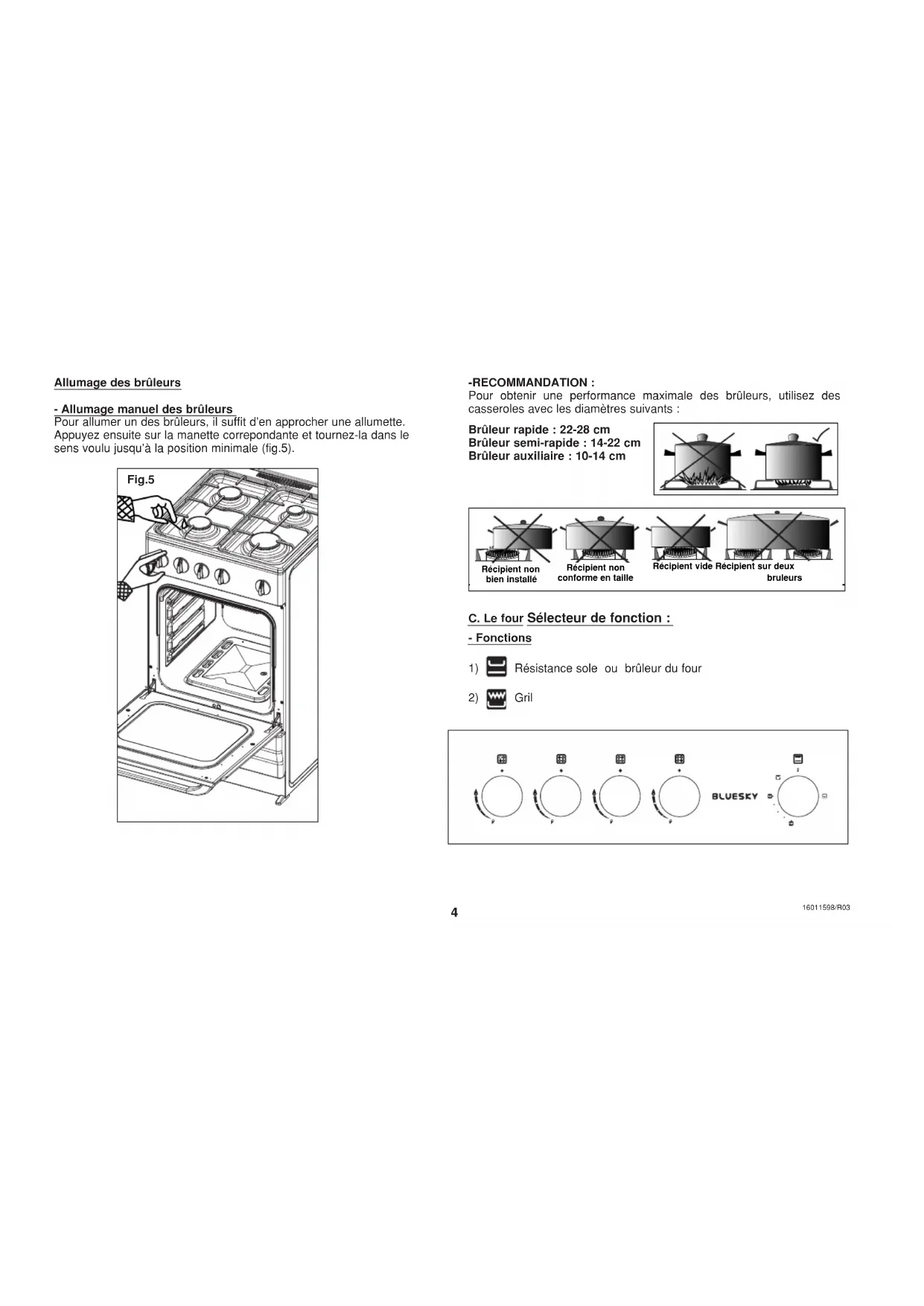 Tableau 2 Fig.4Allumage des brûleurs - Allumage manuel des brûleurs Pour allumer un des brûleurs, il suffit d’en approcher une allumette. Appuyez ensuite sur la manette correpondante et tournez-la dans le sens voulu jusqu’à la position minimale (fig.5). -RECOMMANDATION : Pour obtenir une performance maximale des brûleurs, utilisez des casseroles avec les diamètres suivants : Brûleur rapide : 22-28 cm Brûleur semi-rapide : 14-22 cm Brûleur auxiliaire : 10-14 cm C. Le four Sélecteur de fonction : - Fonctions