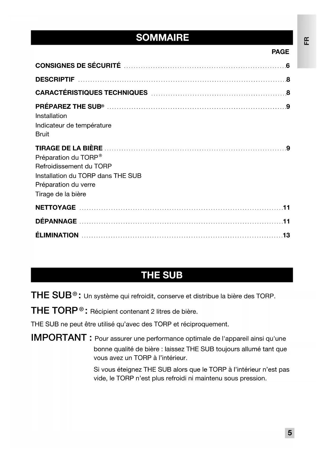 - En cas d’utilisation inappropriée ou de non-respect des instructions, le fabricant décline toute responsabilité et la garantie devient nulle. Utilisez seulement des TORP compatibles avec THE SUB, produits et commercialisés par le Groupe Heineken.