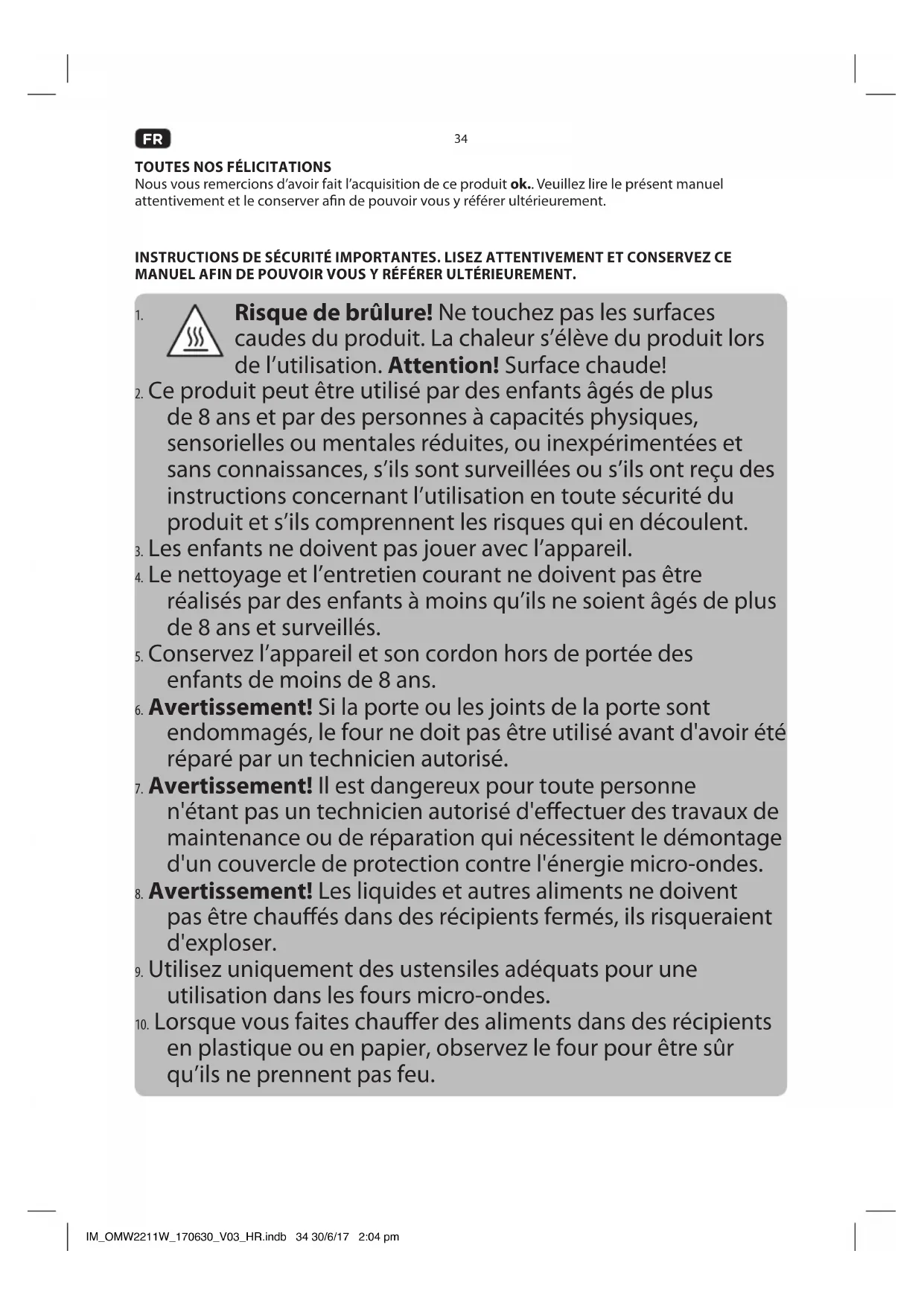 en plastique ou en papier, observez le four pour être sûr qu’ils ne prennent pas feu. IM_OMW2211W_170630_V03_HR.indb 34 30/6/17 2:04 pm35