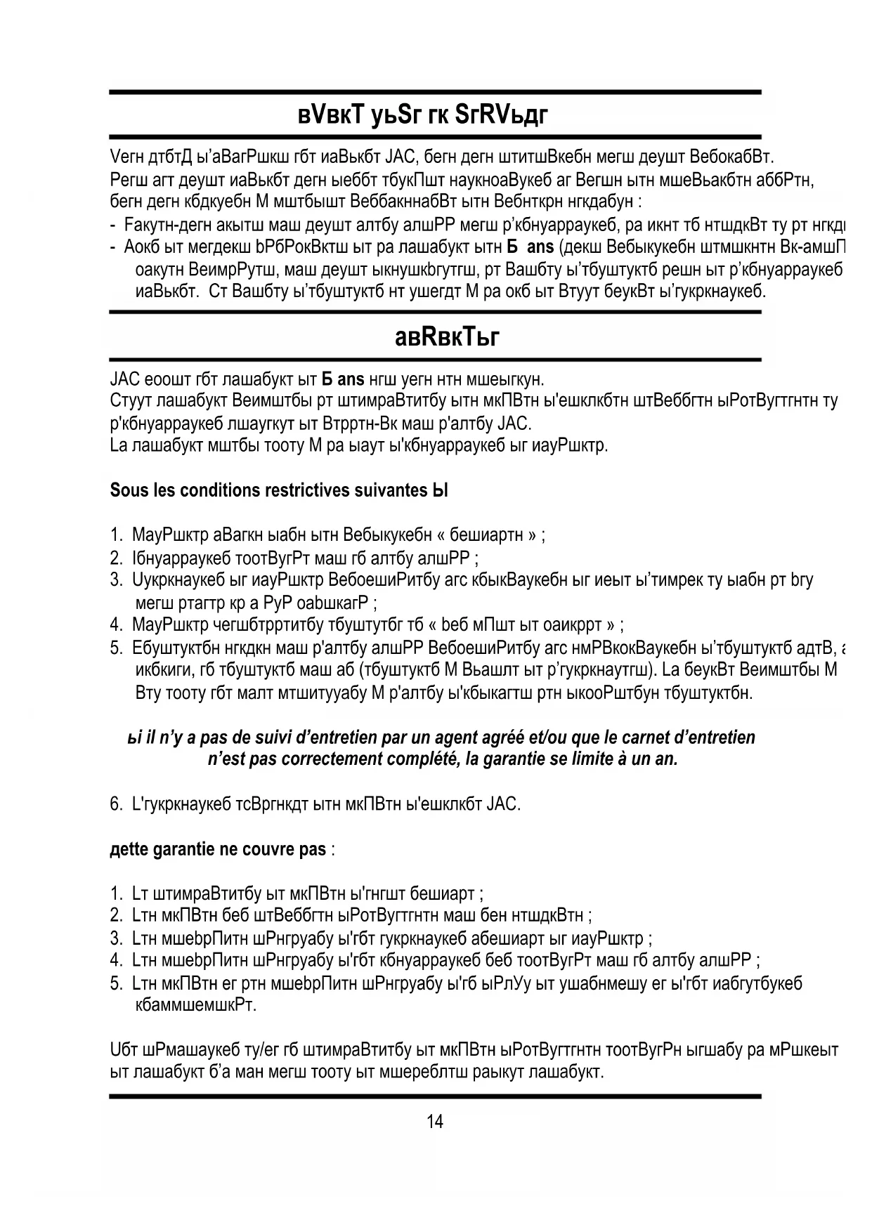 17 ENTRETIENVous venez d’acquérir une machine JAC, nous vous remercions pour votre confiance. Pour que votre machine vous donne entière satisfaction au cours des prochaines années, nous vous invitons à prendre connaissance des conseils suivants : - Faites-vous aider par votre agent agréé pour l’installation, la mise en service et le suivi ; - Afin de pouvoir bénéficier de la garantie des 3 ans (voir conditions reprises ci-après), faites compléter, par votre distributeur, le carnet d’entretien lors de l’installation de votre machine. Ce carnet d’entretien se trouve à la fin de cette notice d’utilisation. JAC offre une garantie de 3 ans sur tous ses produits. Cette garantie comprend le remplacement des pièces d'origines reconnues défectueuses et l'installation gratuite de celles-ci par l'agent JAC. La garantie prend effet à la date d'installation du matériel. Sous les conditions restrictives suivantes :