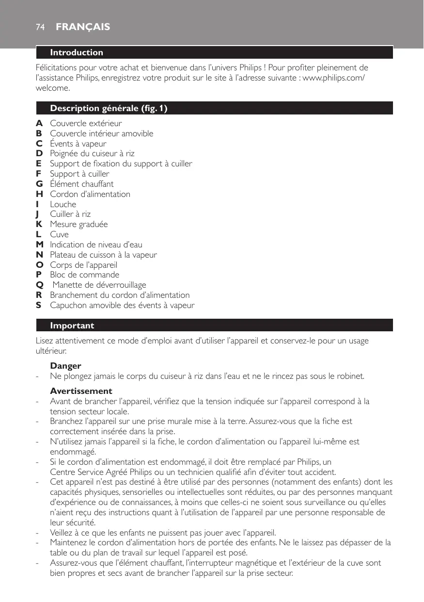 Danger -- Ne plongez jamais le corps du cuiseur à riz dans l’eau et ne le rincez pas sous le robinet. Avertissement -- Avant de brancher l’appareil, vérifiez que la tension indiquée sur l’appareil correspond à la tension secteur locale. -- Branchez l’appareil sur une prise murale mise à la terre. Assurez-vous que la fiche est correctement insérée dans la prise. -- N’utilisez jamais l’appareil si la fiche, le cordon d’alimentation ou l’appareil lui-même est endommagé. -- Si le cordon d’alimentation est endommagé, il doit être remplacé par Philips, un Centre Service Agréé Philips ou un technicien qualifié afin d’éviter tout accident. -- Cet appareil n’est pas destiné à être utilisé par des personnes (notamment des enfants) dont les capacités physiques, sensorielles ou intellectuelles sont réduites, ou par des personnes manquant d’expérience ou de connaissances, à moins que celles-ci ne soient sous surveillance ou qu’elles n’aient reçu des instructions quant à l’utilisation de l’appareil par une personne responsable de leur sécurité. -- Veillez à ce que les enfants ne puissent pas jouer avec l’appareil. -- Maintenez le cordon d’alimentation hors de portée des enfants. Ne le laissez pas dépasser de la table ou du plan de travail sur lequel l’appareil est posé. -- Assurez-vous que l’élément chauffant, l’interrupteur magnétique et l’extérieur de la cuve sont bien propres et secs avant de brancher l’appareil sur la prise secteur.