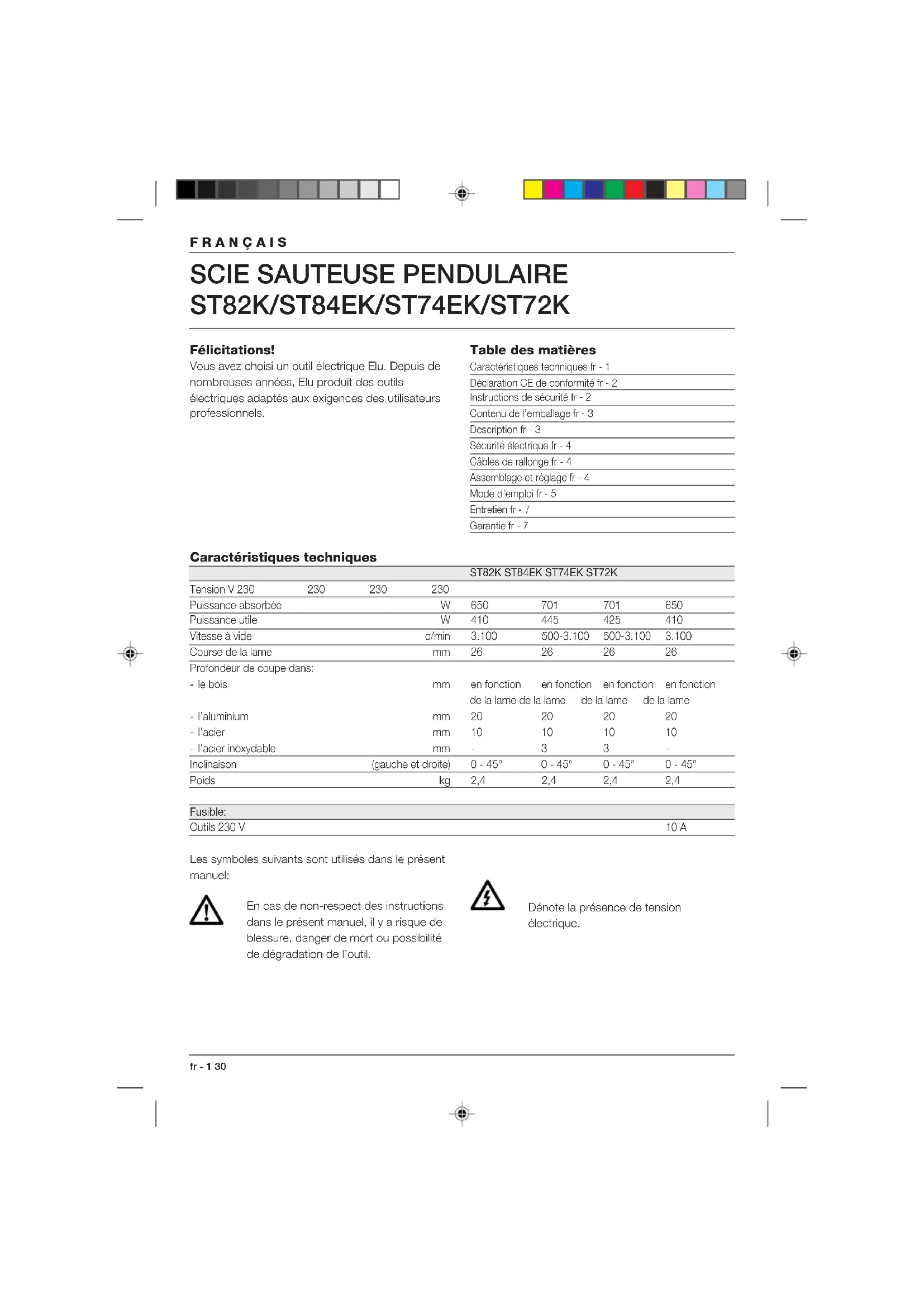 ST82K/ST84EK/ST74EK/ST72K Félicitations! Vous avez choisi un outil électrique Elu. Depuis de nombreuses années, Elu produit des outils électriques adaptés aux exigences des utilisateurs professionnels. Table des matières Caractéristiques techniques fr - 1 Déclaration CE de conformité fr - 2 Instructions de sécurité fr - 2 Contenu de l’emballage fr - 3 Description fr - 3 Sécurité électrique fr - 4 Câbles de rallonge fr - 4 Assemblage et réglage fr - 4 Mode d’emploi fr - 5 Entretien fr - 7 Garantie fr - 7 Caractéristiques techniques ST82K ST84EK ST74EK ST72K Tension V 230 230 230 230 Puissance absorbée W 650 701 701 650 Puissance utile W 410 445 425 410 Vitesse à vide c/min 3.100 500-3.100 500-3.100 3.100 Course de la lame mm 26 26 26 26 Profondeur de coupe dans: - le bois mm en fonction en fonction en fonction en fonction de la lame de la lame de la lame de la lame - l’aluminium mm 20 20 20 20 - l’acier mm 10 10 10 10 - l’acier inoxydable mm - 3 3 - Inclinaison (gauche et droite) 0 - 45° 0 - 45° 0 - 45° 0 - 45° Poids kg 2,4 2,4 2,4 2,4 Fusible: Outils 230 V 10 A Les symboles suivants sont utilisés dans le présent manuel: En cas de non-respect des instructions dans le présent manuel, il y a risque de blessure, danger de mort ou possibilité de dégradation de l’outil. Dénote la présence de tension électrique.FRANÇAIS 31 fr - 2 Déclaration CE de conformité ST82K/ST84EK/ST74EK/ST72K Elu déclare que ces outils ont été mis au point en conformité avec les normes 98/37/CEE, 89/336/CEE, 73/23/CEE, EN 50144, EN 55014-2, EN 55014, EN 61000-3-2 & EN 61000-3-3. Pour de plus amples informations, contacter Elu à l’adresse ci-dessous ou se reporter au dos de ce manuel. Niveau de pression acoustique suivant 86/188/CEE & 98/37/CEE, mesuré suivant EN 50144: ST82K ST84EK ST74EK ST72K