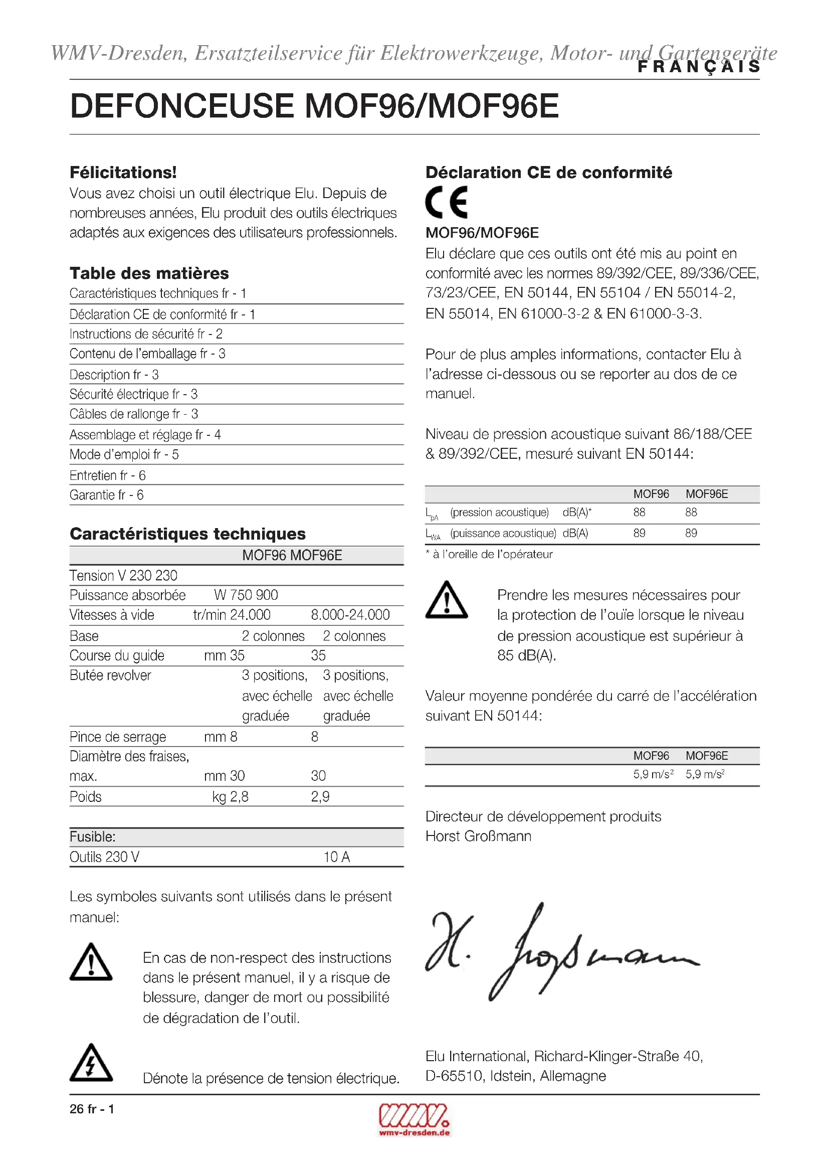 Directeur de développement produits Horst Großmann Elu International, Richard-Klinger-Straße 40, D-65510, Idstein, Allemagne WMV-Dresden, Ersatzteilservice für Elektrowerkzeuge, Motor- und GartengeräteFRANÇAIS fr - 2 27 Instructions de sécurité Afin de réduire le risque de décharge électrique, de blessure et d’incendie lors de l’utilisation d’outils électriques, observer les consignes de sécurité fondamentales en vigueur. Lire les instructions avant d’utiliser l’outil. Conserver ces instructions de sécurité! Généralités 1 Tenir votre aire de travail propre et bien rangée Le désordre augmente les risques d’accident. 2 Tenir compte des conditions ambiantes Ne pas exposer les outils électriques à l’humidité. Veiller à ce que l’aire de travail soit bien éclairée. Ne pas utiliser d’outils électriques en présence de liquides ou de gaz inflammables. 3 Attention aux décharges électriques Eviter le contact corporel avec des éléments reliés à la terre, comme par exemple tuyaux, radiateurs, cuisinières électriques et réfrigérateurs. Sous des conditions de travail extrêmes (par exemple: humidité élevée, dépôt de poussières métalliques, etc.) la sécurité électrique peut être augmentée en insérant un transformateur d’isolation ou un disjoncteur différentiel (FI). 4 Tenir les enfants éloignés Ne pas permettre que d’autres personnes touchent l’outil ou le câble de rallonge. La supervision est obligatoire pour les moins de 16 ans. 5 Câble de rallonge pour l’extérieur A l’extérieur, n’utiliser que des câbles de rallonge homologués portant le marquage correspondant. 6 Ranger vos outils dans un endroit sûr Ranger les outils non utilisés dans un endroit sec, fermé à clé et hors de la portée des enfants. 7 Porter des vêtements de travail appropriés Ne pas porter de vêtements flottants ou de bijoux. Ils pourraient être happés par les pièces en mouvement. Lors de travaux à l’extérieur, il est recommandé de porter des gants en caoutchouc et des chaussures à semelle anti- dérapante. Le cas échéant, porter une garniture convenable retenant les cheveux longs. 8 Porter des lunettes de protection Utiliser aussi un masque si le travail exécuté produit de la poussière ou des copeaux volants. 9 Attention au niveau de pression acoustique Prendre les mesures nécessaires pour la protection de l’ouïe lorsque le niveau de pression acoustique est supérieur à 85 dB(A). 10 Bien fixer la pièce à travailler Pour plus de sécurité, fixer la pièce à travailler avec un dispositif de serrage ou un étau. Ainsi, vous aurez les deux mains libres pour manier l’outil. 11 Adopter une position confortable Toujours tenir les deux pieds à terre et garder l’équilibre. 12 Eviter tout démarrage involontaire Ne pas porter l’outil en ayant un doigt placé sur l’interrupteur. Mettre l’interrupteur en position arrêt avant de mettre la fiche dans la prise. 13 Faire preuve de vigilance Observer votre travail. Faire preuve de bon sens. Ne pas employer l’outil en cas de fatigue. 14 Enlever la fiche de la prise Débrancher l’outil et attendre qu’il soit complète- ment immobilisé avant de le poser, de procéder à l’entretien ou au changement d’accessoires. 15 Enlever les clés de réglage Avant de mettre l’outil en marche, retirer les clés et outils de réglage. 16 Utiliser l’outil adéquat Le domaine d’utilisation de l’outil est décrit dans le présent manuel. Ne pas utiliser d’outils ou d’accessoires de trop faible puissance pour exécuter des travaux lourds. Ne pas utiliser des outils à des fins et pour des travaux pour lesquels ils n’ont pas été conçus. Attention! L’utilisation d’accessoires autres que ceux recommandés dans le présent manuel pourrait entraîner un risque de blessure. Utiliser l’outil conformément à sa destination. 17 Préserver le câble d’alimentation Ne pas porter l’outil par le câble et ne pas tirer sur celui-ci pour débrancher la fiche de la prise. Préserver le câble de la chaleur, de l’huile et des arêtes vives. 18 Entretenir vos outils avec soin Maintenir vos outils affûtés et propres afin de travailler mieux et plus sûrement. Observer les instructions d’entretien et de changement d’accessoires. Vérifier régulièrement l’état du câble d’alimentation et, s’il est endommagé, le faire changer par votre Service Elu agréé. WMV-Dresden, Ersatzteilservice für Elektrowerkzeuge, Motor- und Gartengeräte28 fr - 3 FRANÇAIS Vérifier périodiquement le câble de rallonge et le remplacer s’il est endommagé. Maintenir les poignées sèches et exemptes d’huile et de graisse. 19 Contrôler si votre outil est endommagé Avant d’utiliser l’outil, vérifier qu’il n’est pas endommagé. Pour cela, contrôler l’alignement des pièces en mouvement et leur grippage éventuel. Tous les composants doivent être montés correctement et remplir les conditions pour garantir le fonctionnement impeccable de l’outil. Faire réparer ou échanger tout dispositif de sécurité et toute pièce endommagée conformément aux instructions. Ne pas utiliser l’outil quand l’interrupteur est défectueux. Faire remplacer l’interrupteur par un Service Elu agréé. 20 Faire réparer votre outil par un Service Elu agréé Cet outil est conforme aux consignes de sécurité en vigueur. La réparation des outils électriques est strictement réservée aux personnes qualifiées. Directives de sécurité additionnelles pour fraises
