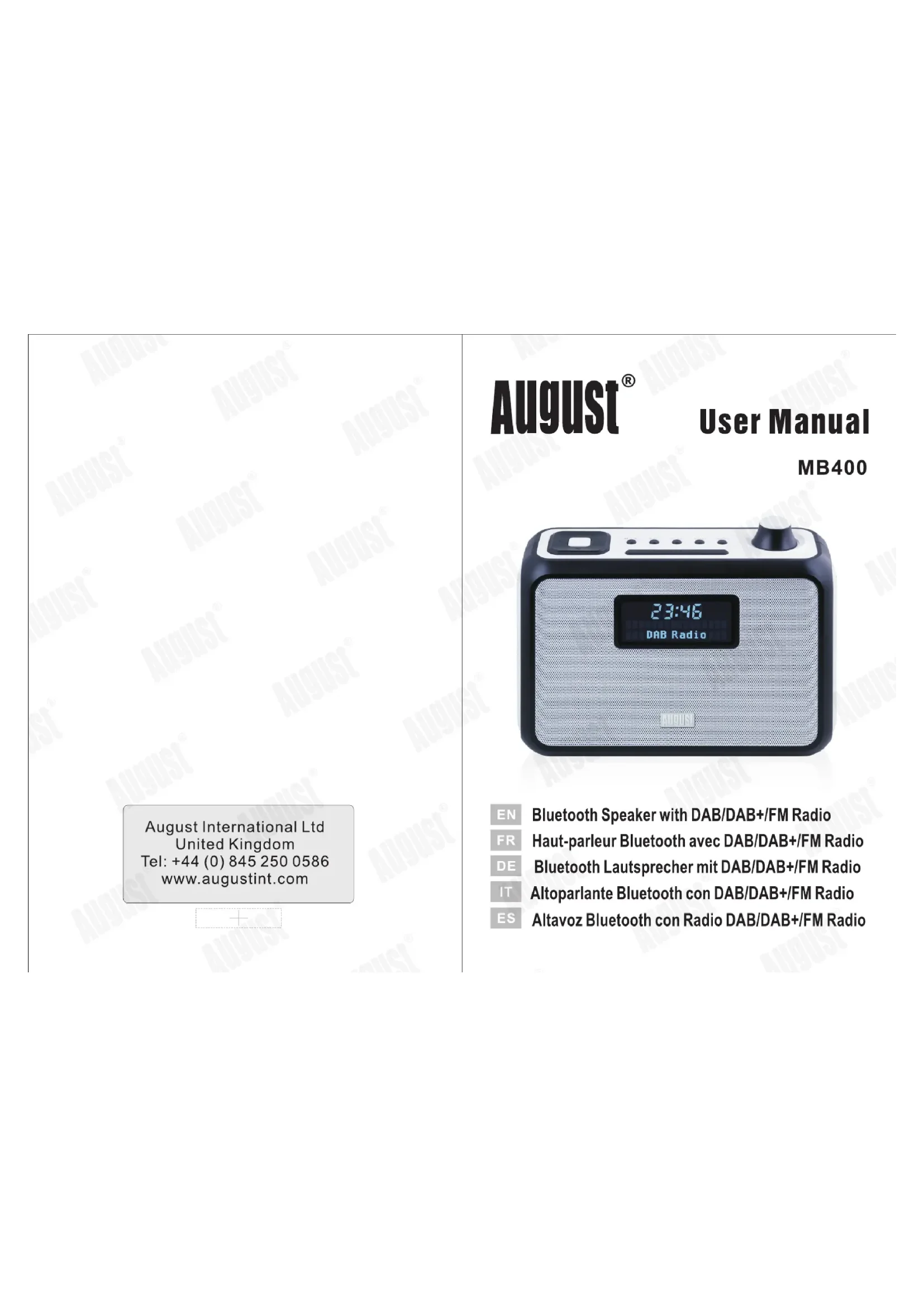Nous vous remercions d'avoir acheté le haut-parleur Bluetooth avec radio DAB+/DAB/FM MB400 de August. Ce mode d'emploi vous aidera à vous familiariser avec toutes les options de l'appareil. Veuillez prendre quelques instants pour le lire attentivement, même si vous êtes déjà familier avec un produit similaire.