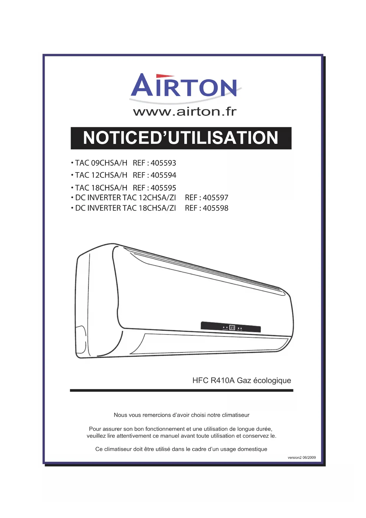 HFC R410A Gaz écologiqueNous vous remercions d’avoir choisi notre climatiseurPour assurer son bon fonctionnement et une utilisation de longue durée, veuillez lire attentivement ce manuel avant toute utilisation et conservez le.Ce climatiseur doit être utilisé dans le cadre d’un usage domestiqueversion2 06/2009• Avant tout, veuillez prendre connaissance des informations mentionnées en page annexe ainsi que des conditions de prise en charge SAV présentées dans votre carnet de garantie. Si l’un de ces deux documents est manquant lors de votre achat, veuillez contacter notre service après vente• Veuillez lire les indications suivantes attentivement et vous assurez de leur compréhension avant de procéder à l’installation de votre climatiseur. Installation = Pose + Mise en service Définition de la pose :Placer et fixer les différents éléments (Unités intérieure & extérieure) et percer le/les murs pour le passage des raccordements frigorifiques & électriques. Positionner les raccordements frigorifiques et câblage électrique SANS FAIRE LES CONNEXIONS. Positionner le tuyau d’évacuation condensat Ce travail peut être effectué par un bricoleur averti qui suit avec rigueur les instructions et consignes mais exige d’avoir un minimum d’outillage, de patience et de force physique.Définition de la mise en service : Vérifier la pose et l’adéquation entre le produit et le site (l’adaptabilité du type de climatiseur avec la pièce à rafraîchir et l’emplacement) procéder au connexion des raccordements frigorifiques et électriques, mise sous tension éléctrique et pression frigorifique, tester l’étanchéité du circuit, tester le produit et expliquer son fonctionnement, vérifier l’écoulement des condensats. NOTIONS IMPORTANTES Veuillez prendre connaissance des garanties et conditions.La mise en service doit être effectuée par un frigoriste/opérateur qualifiéPour une mise en relation avec un opérateur/frigoriste de notre réseau, contactez nous : - sur notre site internet www.airton.fr - Par téléphone au N° INDIGO 0825 074 100 (Coût de l’appel : 0,15 euros/min poste fixe) Vous avez acheté le RACCORDEMENT READYCLIM SIMPLE, RAPIDE ET SECURISE OPTION 1 *Assurez vous que le frigoriste est bien équipé et utilise le matériel adapté (station de récupération de fluide et pompe à vide)Seuls, les opérateurs qualifiés peuvent ôter/déchirer les scéllés placées sur les jonctions des unités intérieure et extérieure pour déconnecter les manchons/adaptateurs Vous avez acheté le RACCORDEMENT STANDARD OPTION 2