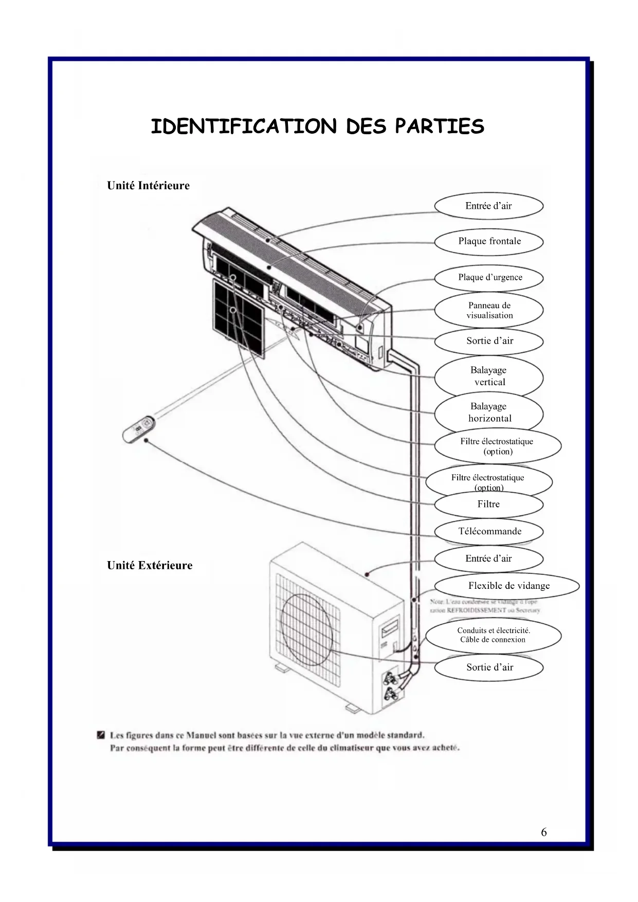 Entrée d'air Plaque frontale Plaque d'urgence Panneau de visualisation Sortie d'air Balayage vertical Balayage horizontal Filtre électrostatique (option) Filtre électrostatique (option) Filtre Télécommande Entrée d'air Flexible de vidange Conduits et électricité. Câble de connexion Sortie d'air Unité Extérieure Note: L'eau condenser se vidange à l'opération REFROIDISSEMENT ou SecretaryLes figures dans ce Manuel sont basées sur la vue externe d'un modèle standard.