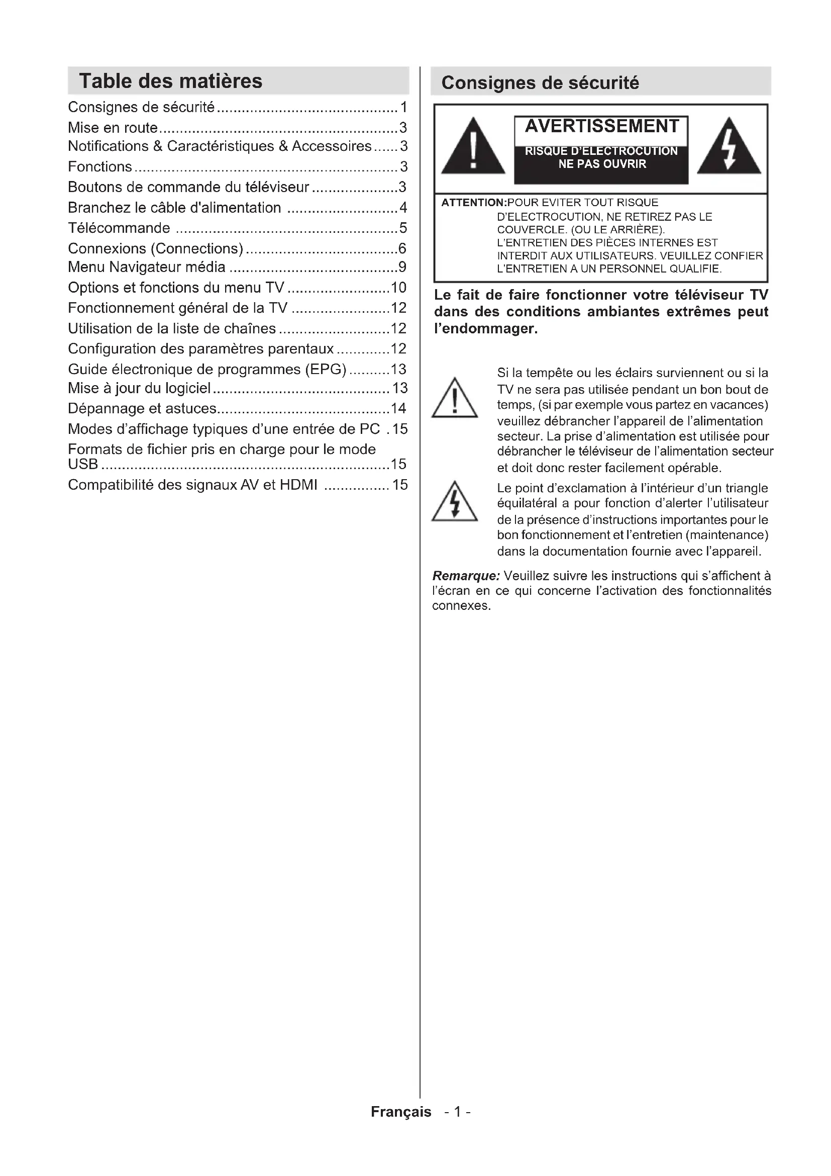 - Français - 1 - Consignes de sécurité Le fait de faire fonctionner votre téléviseur TV dans des conditions ambiantes extrêmes peut l’endommager. AVERTISSEMENT RISQUE D’ELECTROCUTIONNE PAS OUVRIRATTENTION:POUR EVITER TOUT RISQUE D’ELECTROCUTION, NE RETIREZ PAS LE COUVERCLE. (OU LE ARRIÈRE). L’ENTRETIEN DES PIÈCES INTERNES EST INTERDIT AUX UTILISATEURS. VEUILLEZ CONFIER L’ENTRETIEN A UN PERSONNEL QUALIFIE.Remarque: Veuillez suivre les instructions qui s’afchent à l’écran en ce qui concerne l’activation des fonctionnalités connexes.Si la tempête ou les éclairs surviennent ou si la TV ne sera pas utilisée pendant un bon bout de temps, (si par exemple vous partez en vacances) veuillez débrancher l’appareil de l’alimentation secteur. La prise d’alimentation est utilisée pour débrancher le téléviseur de l’alimentation secteur et doit donc rester facilement opérable.Le point d’exclamation à l’intérieur d’un triangle équilatéral a pour fonction d’alerter l’utilisateur de la présence d’instructions importantes pour le bon fonctionnement et l’entretien (maintenance) dans la documentation fournie avec l’appareil. Table des matières Consignes de sécurité p. 1