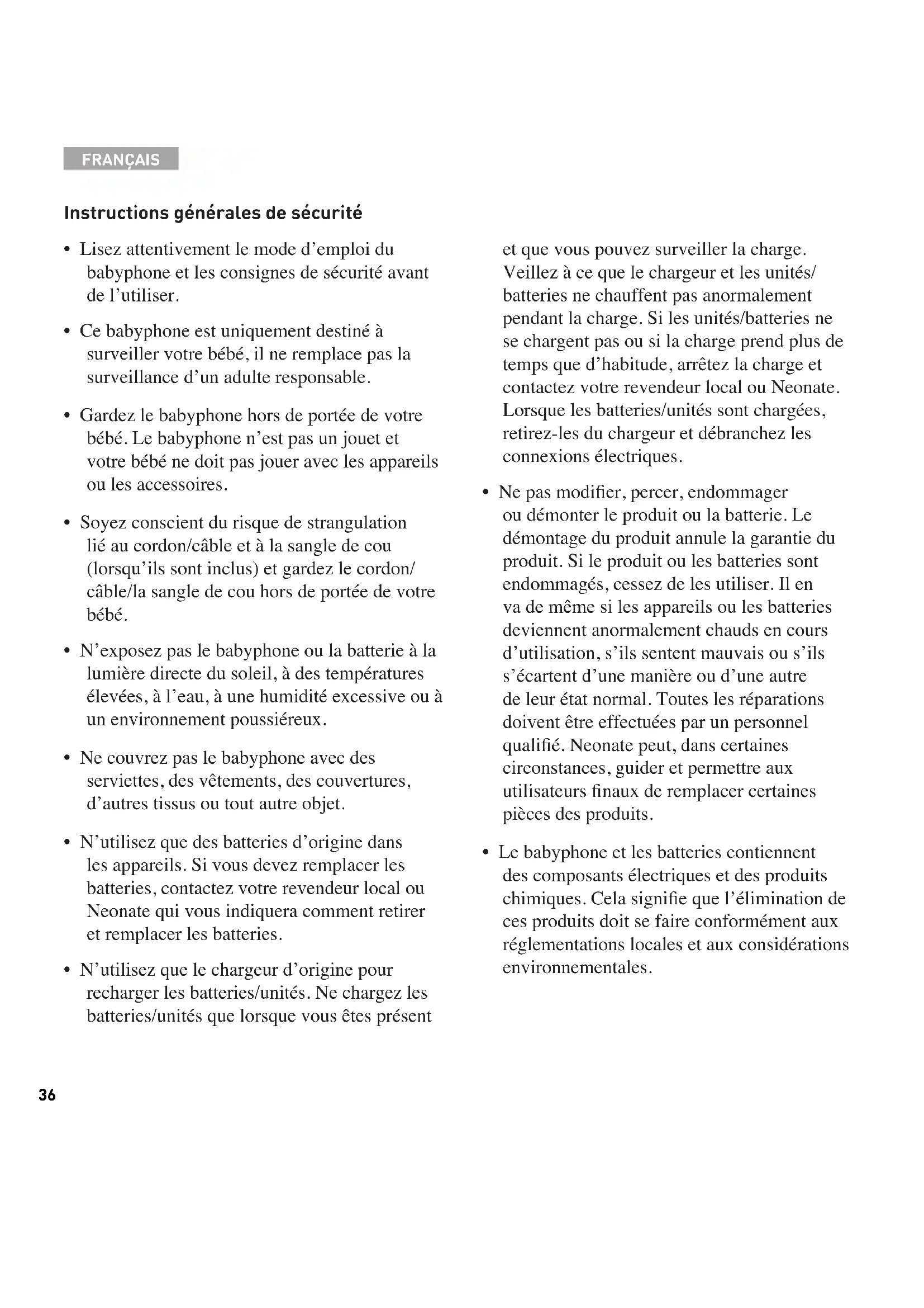 - Ne rechargez pas la batterie à plus que 100 %. Il est conseillé de remplacer la batterie après 600 chargements. Toutes les batteries de Neonate sont garanties pour une période de 2 ans. Informations sur le retrait en toute sécu- rité des batteries ou des accumulateurs Retirez le couvercle arrière de l’appareil dont vous souhaitez retirer l’accumulateur. Soulevez doucement la batterie sans tirer sur les ls. Saisissez le l entre la batterie et le connecteur de batterie blanc dans le compartiment de la batterie. Tirez délicatement sur les ls pour les étirer et exercez une pression sur le connecteur de batterie blanc. Assurez-vous de ne pas tirer sur les ls qui se trouvent sur la batterie elle- même. Le connecteur de batterie à l’extrémité du l doit maintenant se désengager de la carte PCB dans le compartiment de la batterie. Cet appareil électrique contient les batteries ou accumulateurs suivant(e)s Type de batterie Batterie rechargeable lithium-ion polymère Système chimique Dioxyde de cobalt-lithium et graphite38 FRANÇAIS Synchroniser (connecter) les appareils REMARQUE : PU et BU sont déjà synchronisés et prêts à l’utilisation après déballage. Nous recommandons toutefois de les resynchroniser les appareils pour garantir une connexion privée. Unité parent : Maintenez le bouton (+) enfoncé et réglez le bouton ON/OFF en position ON. Ne relâchez pas le bouton (+) avant que PAIR (P) apparaisse à l’écran. Unité bébé : Maintenez le bouton (+) enfon- cé et réglez le bouton ON/OFF en position ON. Ne relâchez pas le bouton (+) avant que PAIR (P) apparaisse à l’écran. Unité bébé : Appuyez sur le bouton (•) pour conrmer la synchronisation entre PU et BU. Deux bips sonores conrment la synchronisation des deux appareils. Tous les appareils : Éteignez et rallumez les appareils en réglant le bouton ON/OFF sur OFF, puis à nouveau sur ON. Les appareils sont alors prêts à fonctionner.