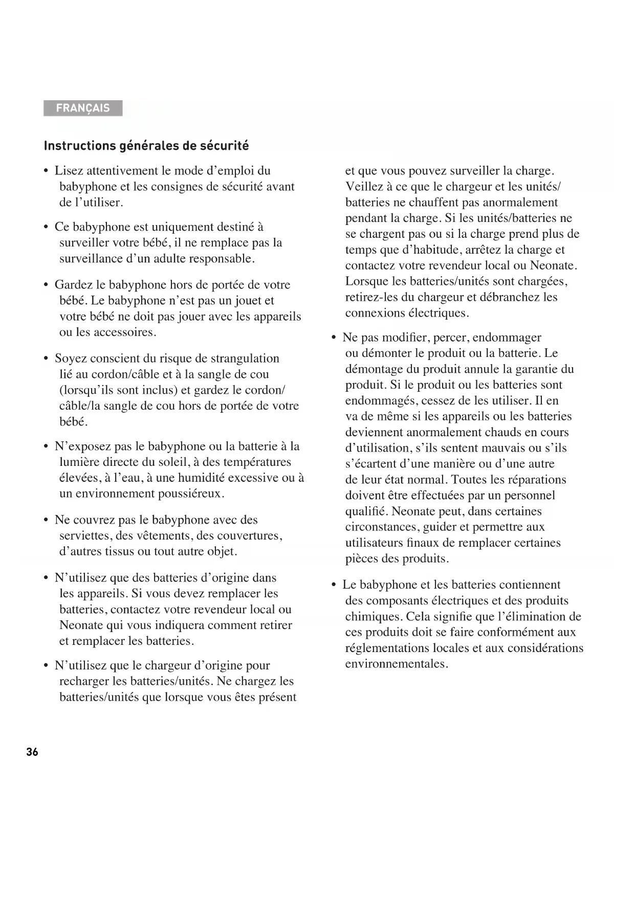 - Ne rechargez pas la batterie à plus que 100 %. Il est conseillé de remplacer la batterie après 600 chargements. Toutes les batteries de Neonate sont garanties pour une période de 2 ans. Informations sur le retrait en toute sécu- rité des batteries ou des accumulateurs Retirez le couvercle arrière de l’appareil dont vous souhaitez retirer l’accumulateur. Soulevez doucement la batterie sans tirer sur les ls. Saisissez le l entre la batterie et le connecteur de batterie blanc dans le compartiment de la batterie. Tirez délicatement sur les ls pour les étirer et exercez une pression sur le connecteur de batterie blanc. Assurez-vous de ne pas tirer sur les ls qui se trouvent sur la batterie elle- même. Le connecteur de batterie à l’extrémité du l doit maintenant se désengager de la carte PCB dans le compartiment de la batterie. Cet appareil électrique contient les batteries ou accumulateurs suivant(e)s Type de batterie Batterie rechargeable lithium-ion polymère Système chimique Dioxyde de cobalt-lithium et graphite38 FRANÇAIS Synchroniser (connecter) les appareils REMARQUE : PU et BU sont déjà synchronisés et prêts à l’utilisation après déballage. Nous recommandons toutefois de les resynchroniser les appareils pour garantir une connexion privée. Unité parent : Maintenez le bouton (+) enfoncé et réglez le bouton ON/OFF en position ON. Ne relâchez pas le bouton (+) avant que PAIR (P) apparaisse à l’écran. Unité bébé : Maintenez le bouton (+) enfon- cé et réglez le bouton ON/OFF en position ON. Ne relâchez pas le bouton (+) avant que PAIR (P) apparaisse à l’écran. Unité bébé : Appuyez sur le bouton (•) pour conrmer la synchronisation entre PU et BU. Deux bips sonores conrment la synchronisation des deux appareils. Tous les appareils : Éteignez et rallumez les appareils en réglant le bouton ON/OFF sur OFF, puis à nouveau sur ON. Les appareils sont alors prêts à fonctionner.
