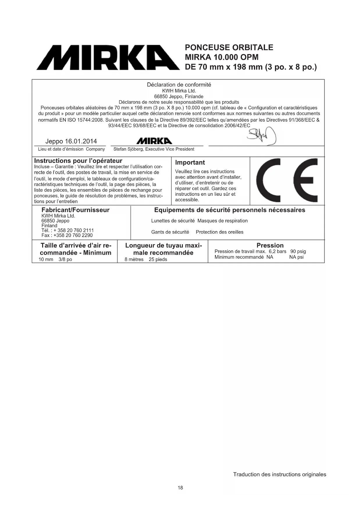 Ponceuses orbitales aléatoires de 70 mm x 198 mm (3 po. X 8 po.) 10.000 opm (cf. tableau de « Configuration et caractéristiques du produit » pour un modèle particulier auquel cette déclaration renvoie sont conformes aux normes suivantes ou autres documents normatifs EN ISO 15744:2008. Suivant les clauses de la Directive 89/392/EEC telles qu'amendées par les Directives 91/368/EEC & 93/44/EEC 93/68/EEC et la Directive de consolidation 2006/42/EC