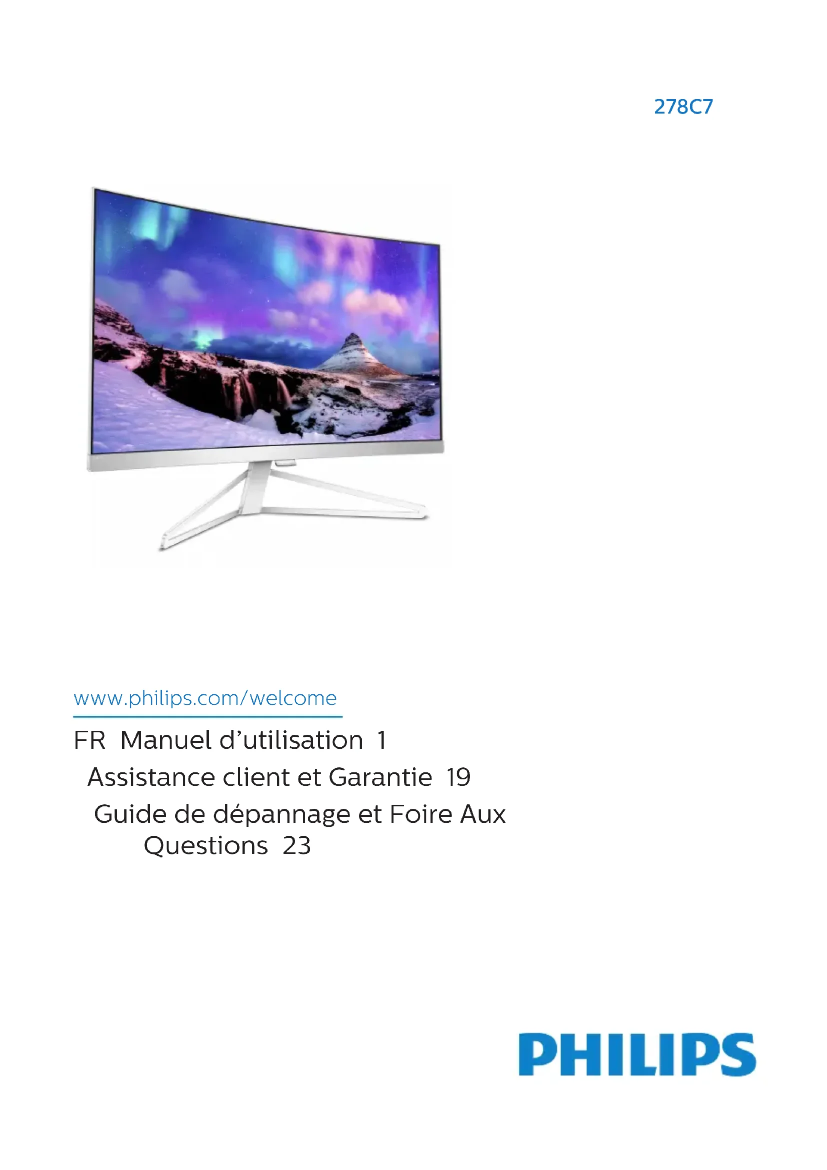 www.philips.com/welcome 278C7 FR Manuel d’utilisation 1 Assistance client et Garantie 19 Guide de dépannage et Foire Aux Questions 23Table des matières