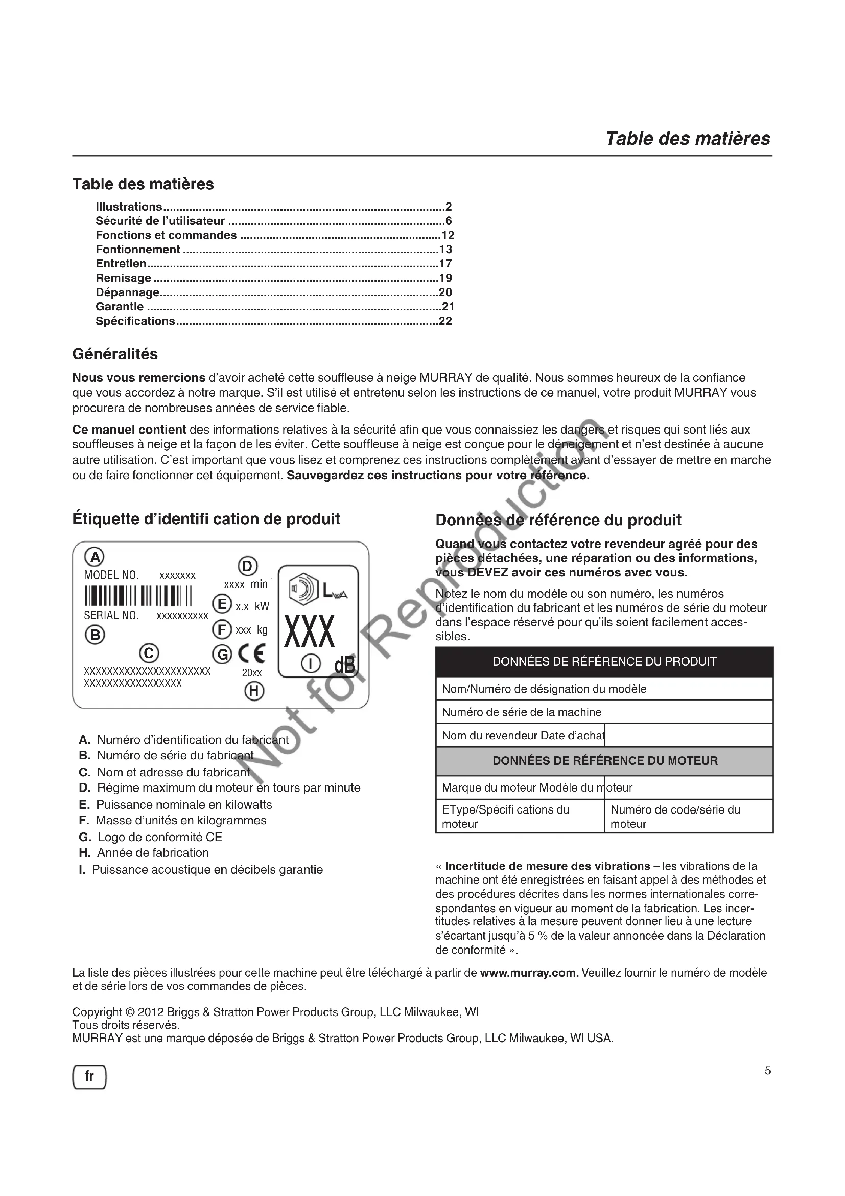 xxx kg XXXXXXXXXXXXXXXXXXXXXXXXXXXXXXXXXXXXXXXA. Numéro d’identification du fabricantB. Numéro de série du fabricantC. Nom et adresse du fabricantD. Régime maximum du moteur en tours par minuteE. Puissance nominale en kilowattsF. Masse d’unités en kilogrammesG. Logo de conformité CEH. Année de fabricationI. Puissance acoustique en décibels garantie La liste des pièces illustrées pour cette machine peut être téléchargé à partir de www.murray.com. Veuillez fournir le numéro de modèle et de série lors de vos commandes de pièces.Copyright © 2012 Briggs & Stratton Power Products Group, LLC Milwaukee, WITous droits réservés.MURRAY est une marque déposée de Briggs & Stratton Power Products Group, LLC Milwaukee, WI USA. Étiquette d’identifi cation de produit « Incertitude de mesure des vibrations – les vibrations de la machine ont été enregistrées en faisant appel à des méthodes et des procédures décrites dans les normes internationales corre-spondantes en vigueur au moment de la fabrication. Les incer-titudes relatives à la mesure peuvent donner lieu à une lecture s’écartant jusqu’à 5 % de la valeur annoncée dans la Déclaration de conformité ». Not for Reproduction6 Sécurité de l’utilisateur Clé de contact MARCHE/ARRÊT. Fermez le starter pour démarrer. Fermez le starter pour démarrer. Appuyez 2 fois sur l’amorceur. Branchez la rallonge. Appuyez sur le bouton de démarrage. Embrayez la tarière. Rotation de la goulotte. Moteur froid. Moteur chaud. Lisez le manuel de l’utilisateur pour les instructions d’utilisation et de sécurité. Arrêtez le moteur et retirez la clé avant de procéder à l’entretien ou à des réparations. Danger de projection d’objets. Risque d’incendie. Tarière rotative/danger d’amputation. Danger d’empoisonnement au monoxyde de carbone. Gardez une distance de sécurité. Décharge électrique. Turbine rotative Danger d’amputation. Tenir les enfants à distance. Turbine rotative Danger d’amputation. Danger d’amputation - ne pas toucher les parties mobiles. Danger de surface chaude. Symboles de risque et leur signifi cation Symboles de contrôle sur l’équipement Not for Reproduction7