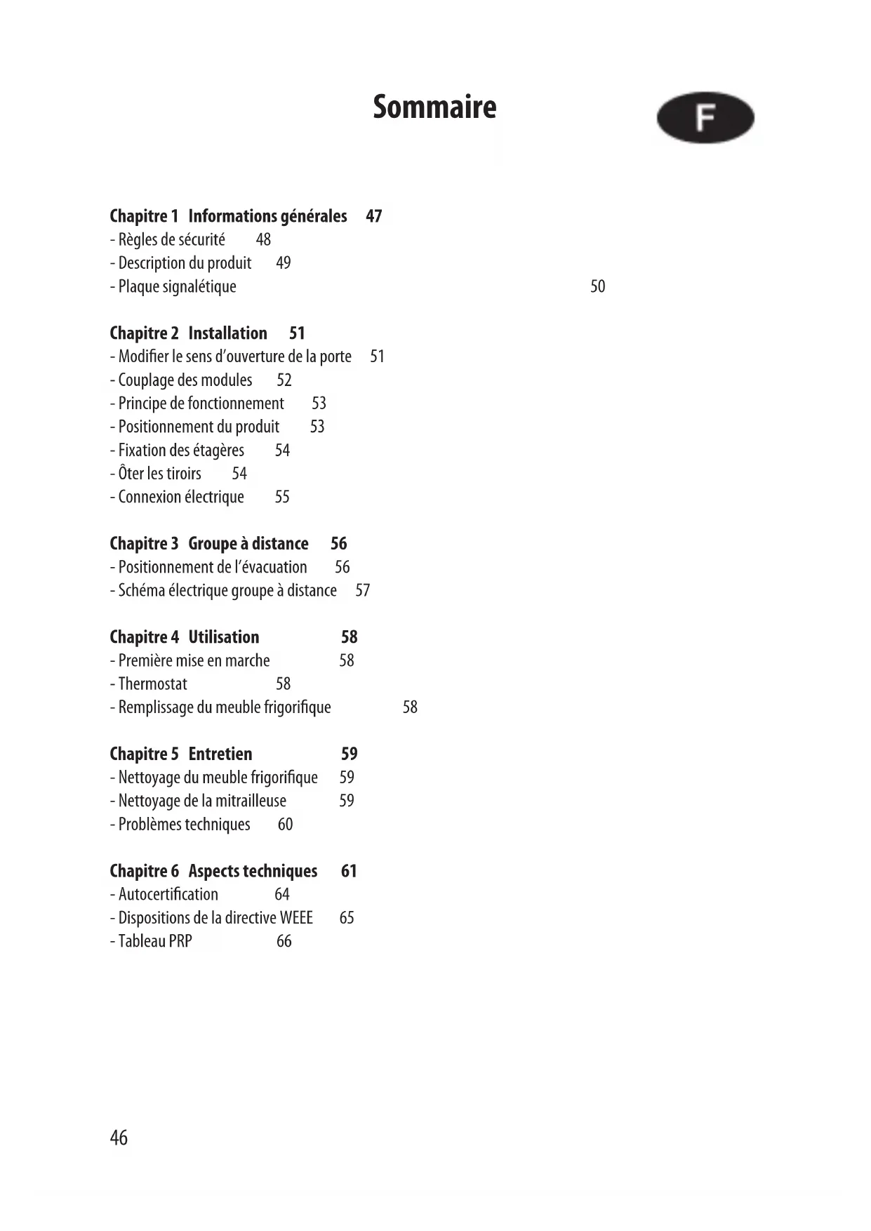 - Modier le sens d’ouverture de la porte 51 - Couplage des modules 52 - Principe de fonctionnement 53 - Positionnement du produit 53 - Fixation des étagères 54 - Ôter les tiroirs 54 - Connexion électrique 55