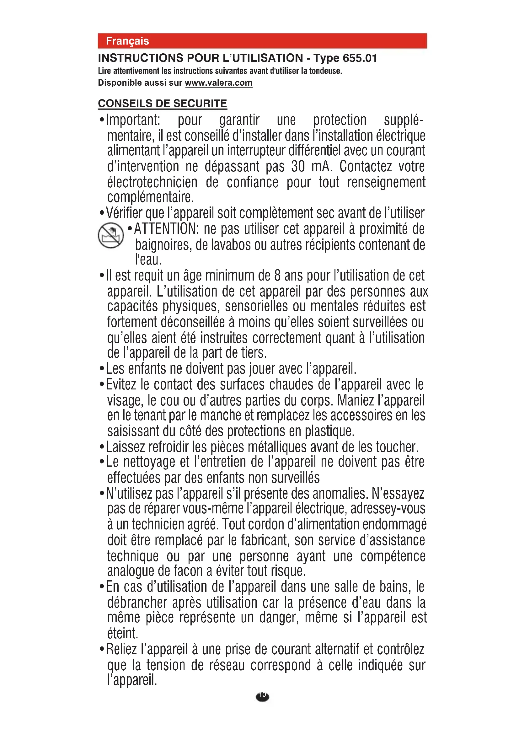- Important: pour garantir une protection supplé- mentaire, il est conseillé d’installer dans l’installation électrique alimentant l’appareil un interrupteur différentiel avec un courant d’intervention ne dépassant pas 30 mA. Contactez votre électrotechnicien de confiance pour tout renseignement complémentaire.