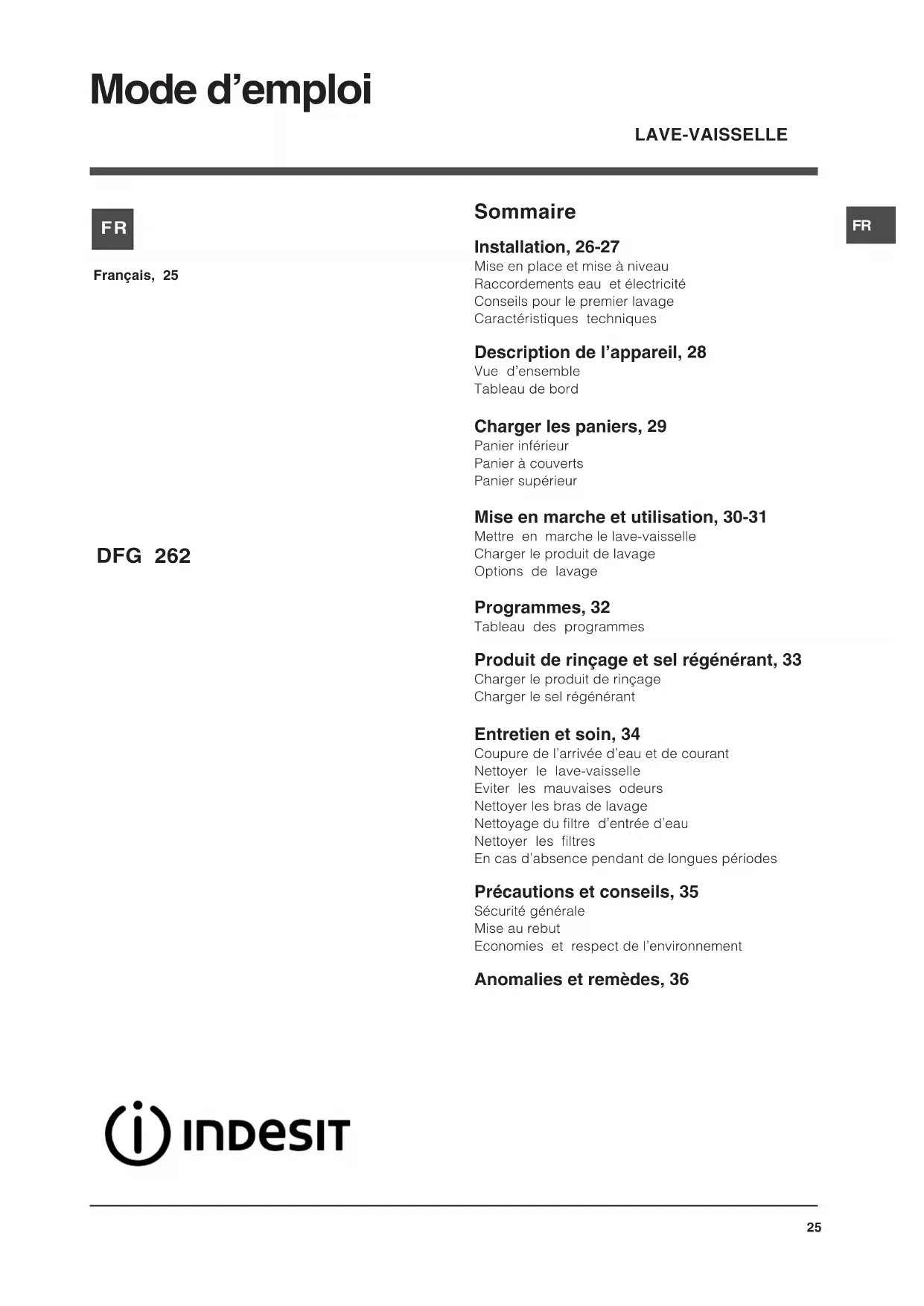 DFG 262 NX EU - Lave-vaisselle INDESIT - Notice d'utilisation et mode d'emploi gratuit