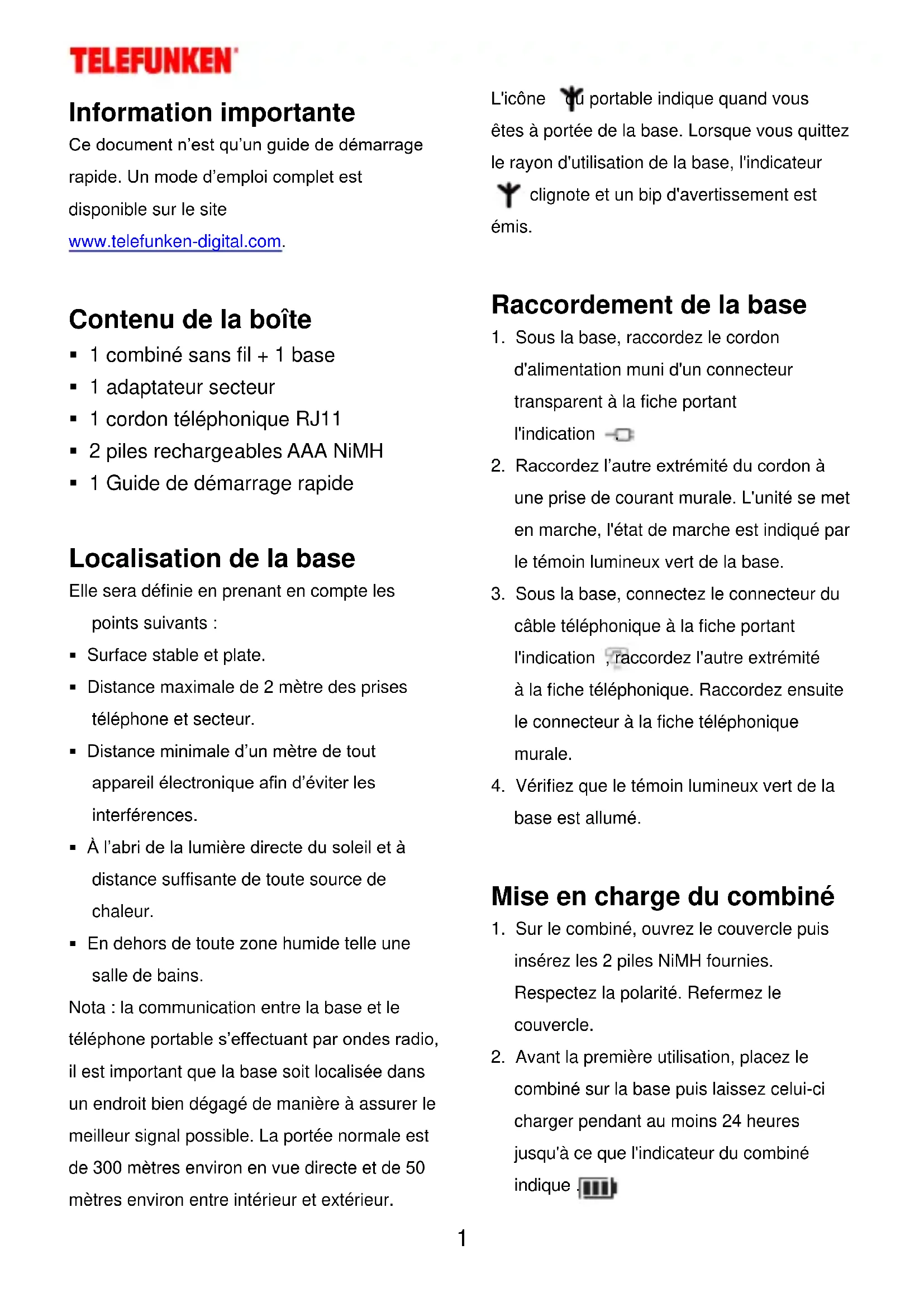 Ce document n'est qu'un guide de démarrage rapide. Un mode d'emploi complet est disponible sur le site www.telefunken-digital.com.