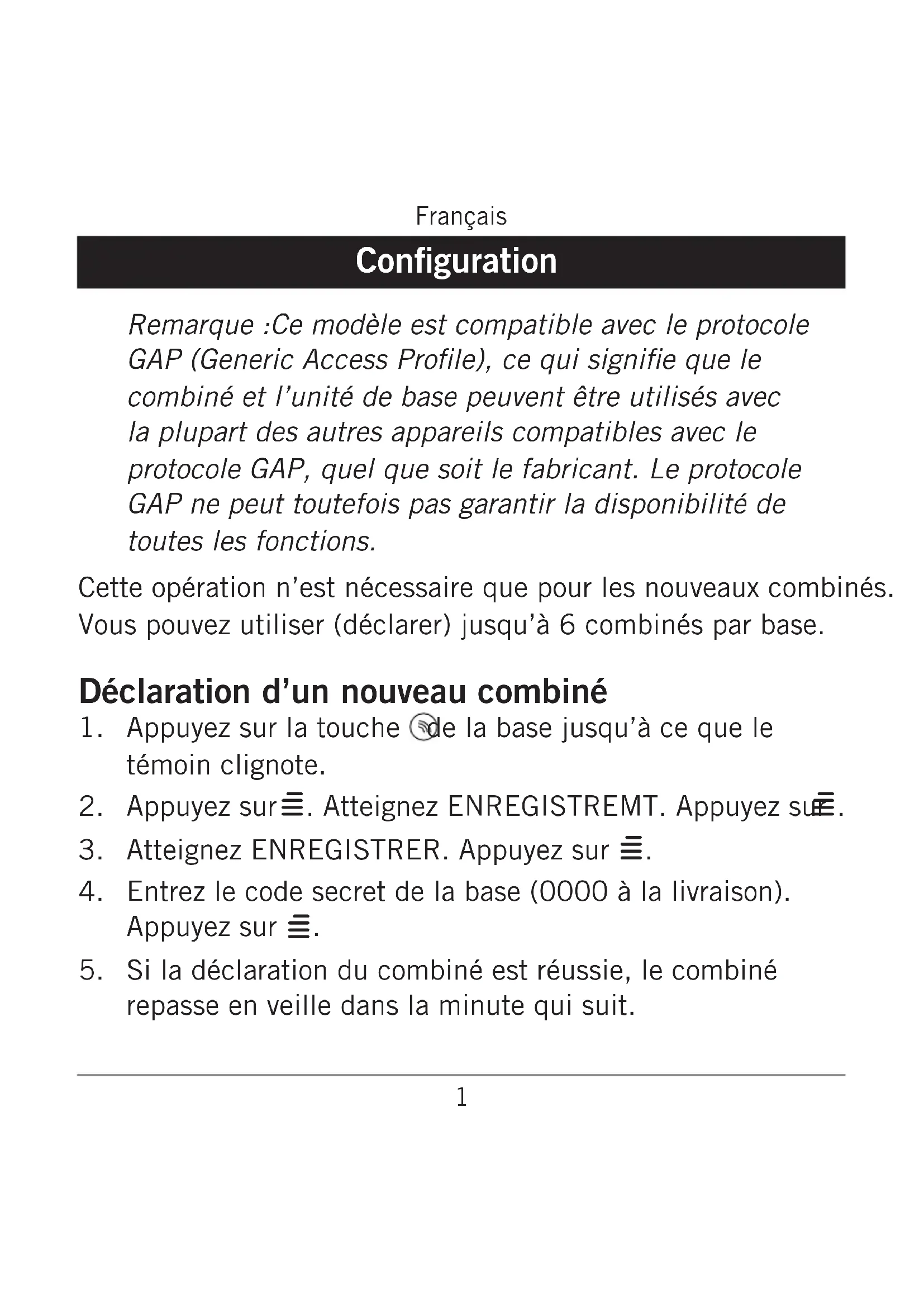 Si la déclaration du combiné est réussie, le combiné repasse en veille dans la minute qui suit.