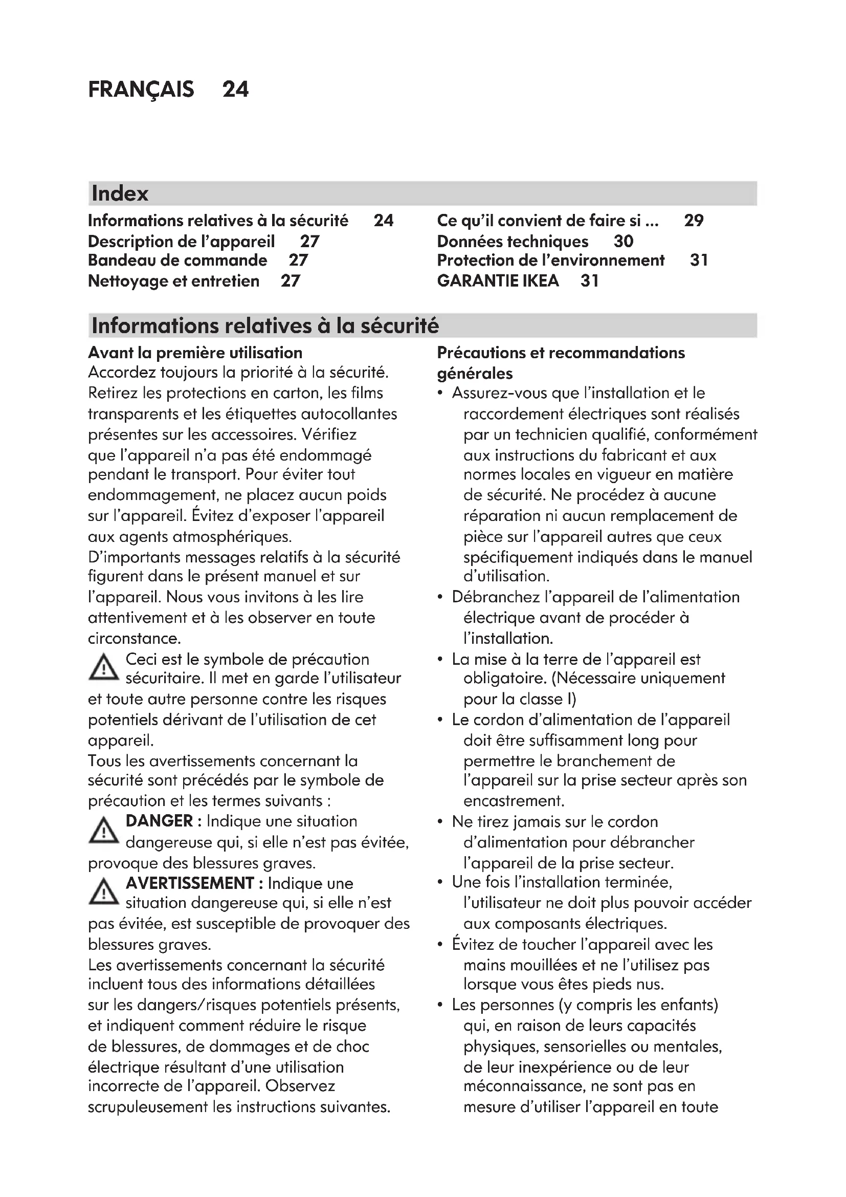 - Les personnes (y compris les enfants) qui, en raison de leurs capacités physiques, sensorielles ou mentales, de leur inexpérience ou de leur méconnaissance, ne sont pas en mesure d’utiliser l’appareil en toute Informationsrelativesàlasécurité 24 Descriptiondel’appareil 27 Bandeaudecommande 27 Nettoyageetentretien 27 Cequ’ilconvientdefairesi... 29 Donnéestechniques 30 Protectiondel’environnement 31 GARANTIEIKEA 31 Informationsrelativesàlasécurité IndexFRANÇAIS 25 sécurité, doivent se servir de l’appareil uniquement sous la surveillance ou en se conformant aux instructions d’une personne responsable.