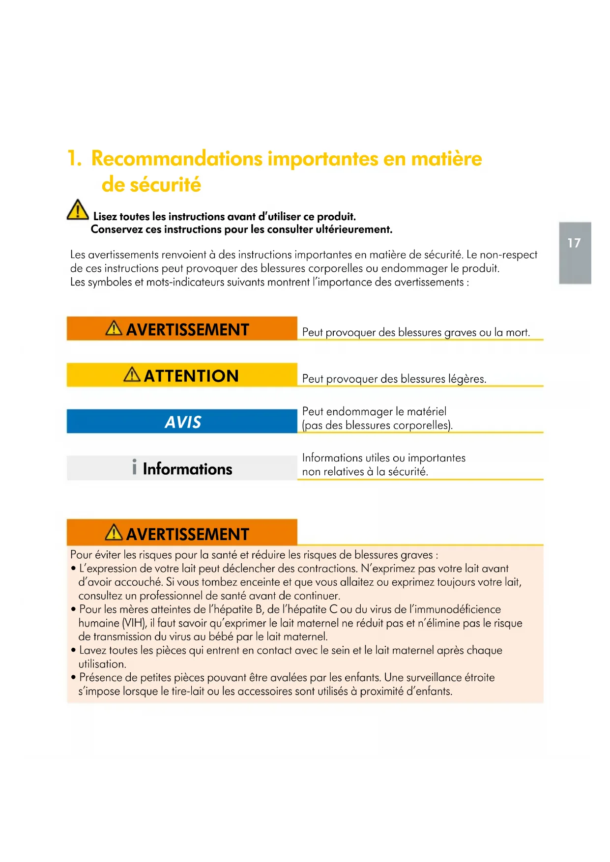 - Deckel: Polypropylen Alle Teile, die in Kontakt mit der Muttermilch kommen, enthalten kein BPA (Bisphenol A). „Ende des Dokuments“ in einen Absatz mit Seitenzählformat eingeben Ende des Dokuments 15161. Recommandations importantes en matière desécurité Lisez toutes les instructions avant d’utiliser ce produit. Conservez ces instructions pour les consulter ultérieurement.Les avertissements renvoient à des instructions importantes en matière de sécurité. Le non-respect de ces instructions peut provoquer des blessures corporelles ou endommager le produit.Les symboles et mots-indicateurs suivants montrent l’importance des avertissements:Peut provoquer des blessures graves ou la mort. AVERTISSEMENT Peut provoquer des blessures légères. ATTENTION Peut endommager le matériel (pas des blessures corporelles). AVIS Informations utiles ou importantes non relatives à la sécurité. i Informations AVERTISSEMENT Pour éviter les risques pour la santé et réduire les risques de blessures graves:• L’expression de votre lait peut déclencher des contractions. N’exprimez pas votre lait avant d’avoir accouché. Si vous tombez enceinte et que vous allaitez ou exprimez toujours votre lait, consultez un professionnel de santé avant de continuer.• Pour les mères atteintes de l’hépatiteB, de l’hépatiteC ou du virus de l’immunodéficience humaine (VIH), il faut savoir qu’exprimer le lait maternel ne réduit pas et n’élimine pas le risque de transmission du virus au bébé par le lait maternel.• Lavez toutes les pièces qui entrent en contact avec le sein et le lait maternel après chaque utilisation.• Présence de petites pièces pouvant être avalées par les enfants. Une surveillance étroite s’impose lorsque le tire-lait ou les accessoires sont utilisés à proximité d’enfants. 17ATTENTION Pour éviter les risques pour la santé et réduire les risques de blessures: