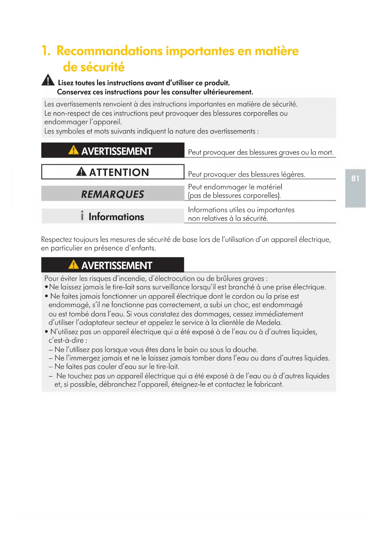 - N’utilisez pas un appareil électrique qui a été exposé à de l’eau ou à d’autres liquides, c’est-à-dire : – Ne l’utilisez pas lorsque vous êtes dans le bain ou sous la douche. – Ne l’immergez jamais et ne le laissez jamais tomber dans l’eau ou dans d’autres liquides. – Ne faites pas couler d’eau sur le tire-lait. – Ne touchez pas un appareil électrique qui a été exposé à de l’eau ou à d’autres liquides et, si possible, débranchez l’appareil, éteignez-le et contactez le fabricant.82 AVERTISSEMENT Pour éviter les risques pour la santé et réduire les risques de blessures graves: