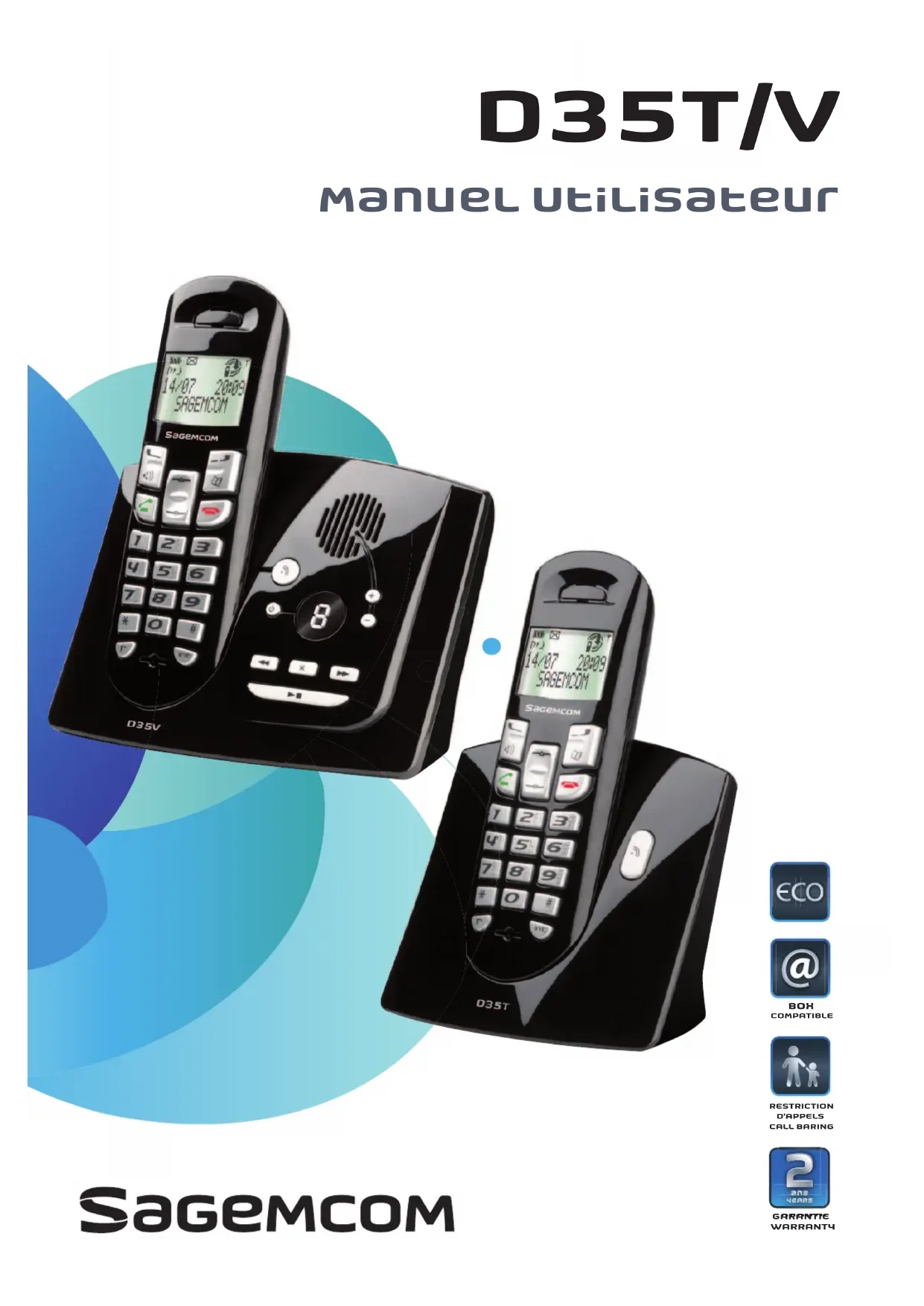 - Erreurs de fonctionnement qui peuvent être attribuées à l'utilisation de produits, de consommables ou d'accessoires non compatibles.56 D35T/V Garantie C) Réparations hors garantie Dans les cas visés sous point B et à l'issue de la période de garantie, le client est tenu de se faire établir un devis par un centre de réparation SAGEMCOM autorisé. Les coûts de réparation et d'expédition sont à la charge du client. Les conditions stipulées ci-dessus sont valables pour autant qu'aucune autre clause écrite n'ait été conclue avec le client et uniquement en France. Vous trouverez sur le site : www.sagemcom.com toutes les informations nécessaires pour effectuer une demande de garantie.57 D35T/V Lexique Lexique Terme DéfinitionAppairage (Paging) La fonction d’appairage (ou Paging ) vous permet d’associer des appareils qui doivent fonctionner par couple (par exemple, une base téléphonique et son combiné) répondant à la norme GAP.Autocommutateur privé (PABX, Private Automatic Branch eXchange) Un PABX sert principalement à relier les postes téléphoniques d'un établissement privé sur le réseau téléphonique public. Conférence à 3 Ce service permet de parler avec deux corresponda nts en même temps. GAP (Generic Access Profile) Le GAP est une norme permet de faire fonctionner les combinés de divers fabricants avec une même base et de composer des appels sur la ligne connectée à la base. De même, un seul combiné peut fonctionner avec plusieurs bases. Intercommunication L’intercommunication établit gratuitement la communication entre plusieurs combinés depuis la même base.Sagemcom Broadband SAS 250, route de l'Empereur - 92848 Rueil-Malmaison - France Tél. +33(0)1 57 61 10 00 - Fax : +33(0)1 57 61 10 01 z www.sagemcom.com Tous droits réservés. Sagemcom Broadband SAS se réserve le droit à tout moment de modifier les caractéristiques techniques de ses produits ou services ou de cesser leur commercialisation. Sagemcom Broadband SAS s'efforce de garantir l'exactitude de toutes les informations figurant dans le présent document, mais ne peut pas être tenu responsable pour d'éventuelles erreurs ou omissions. Document non contractuel. Les marques citées sont déposées par leurs propriétaires respectifs. Société par actions simplifiée au capital de 35 703 000 € - 518 250 360 RCS Nanterre. 253365228A - 28/2/11 Couv1_4.fm Page 2 Jeudi, 24. février 2011 9:54 09